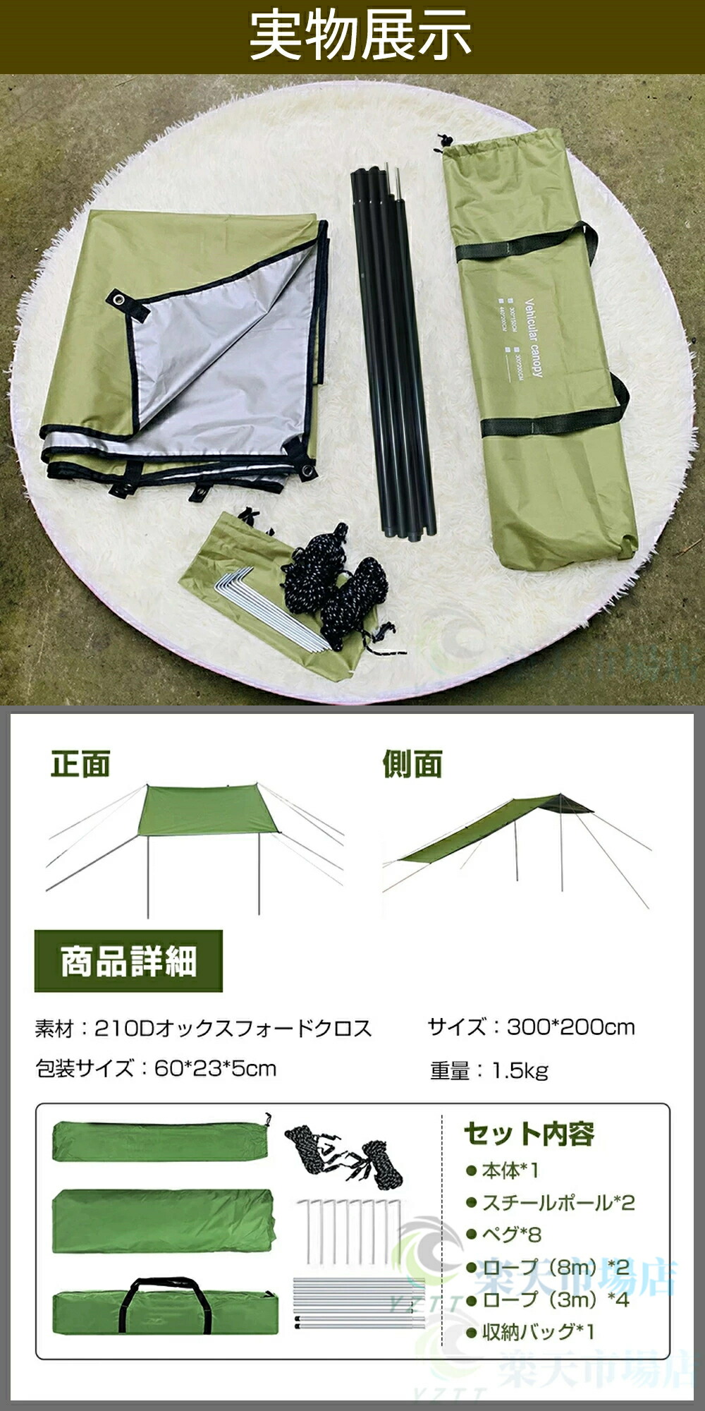 カーサイドタープ タープテント テント スポーツ アウトドア 通販 300*150cm 440*200cm カーキ ブラック グレー グリーン