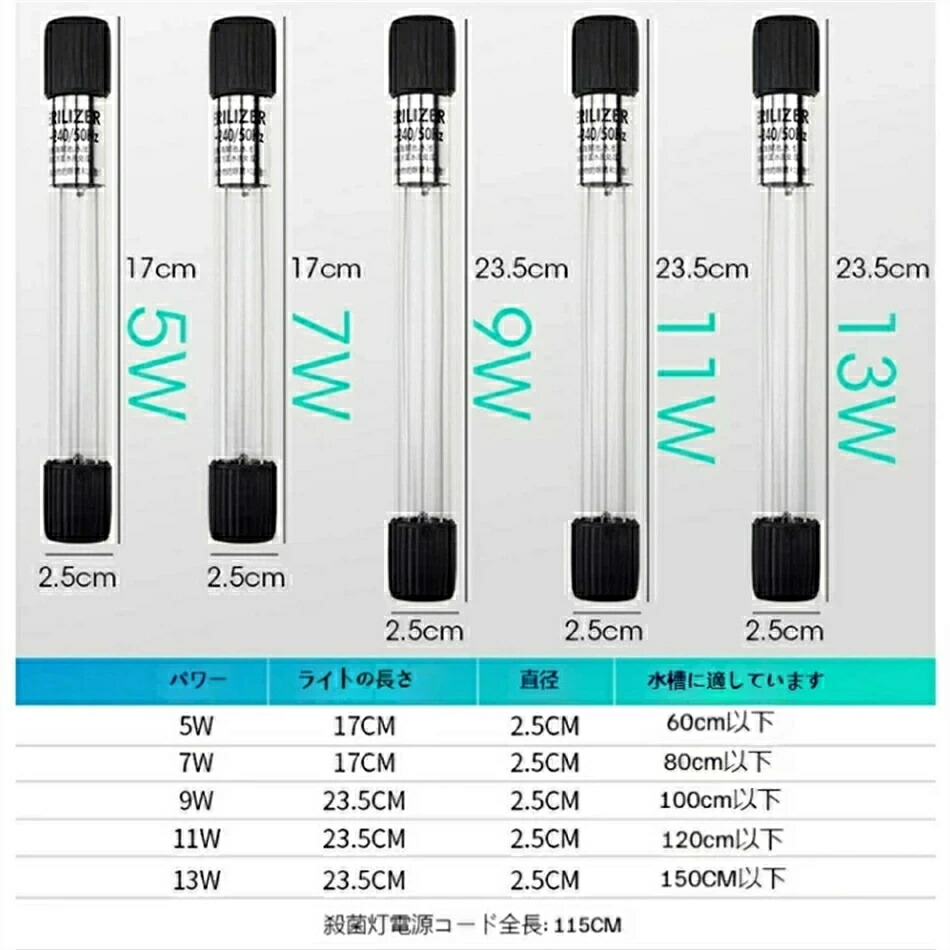 水槽 水中殺菌灯 水槽用UV滅菌ランプ 紫外線ライト 防水 養魚用 池用 緑藻を除去 水質浄化 アクアリウム 水族館の水処理 5W 9W 11W 13W 7W