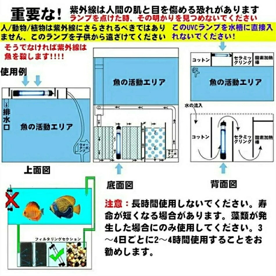 【注意事項】このUVランプは水槽に直接入れることはできません!魚や植物は紫外線に直接さらさないでください。そうしないと紫外線が魚を殺します。紫外線が魚に触れず、魚を傷つけないように、フィルターシステムに入れることをお勧めします。(3番目の製品イメージを参照)