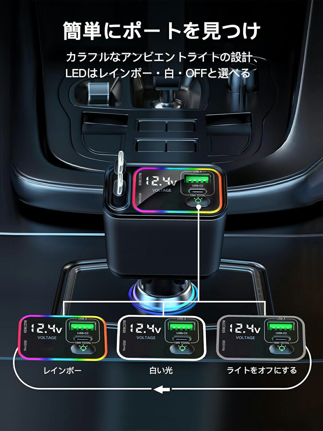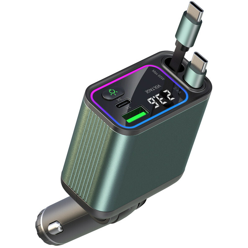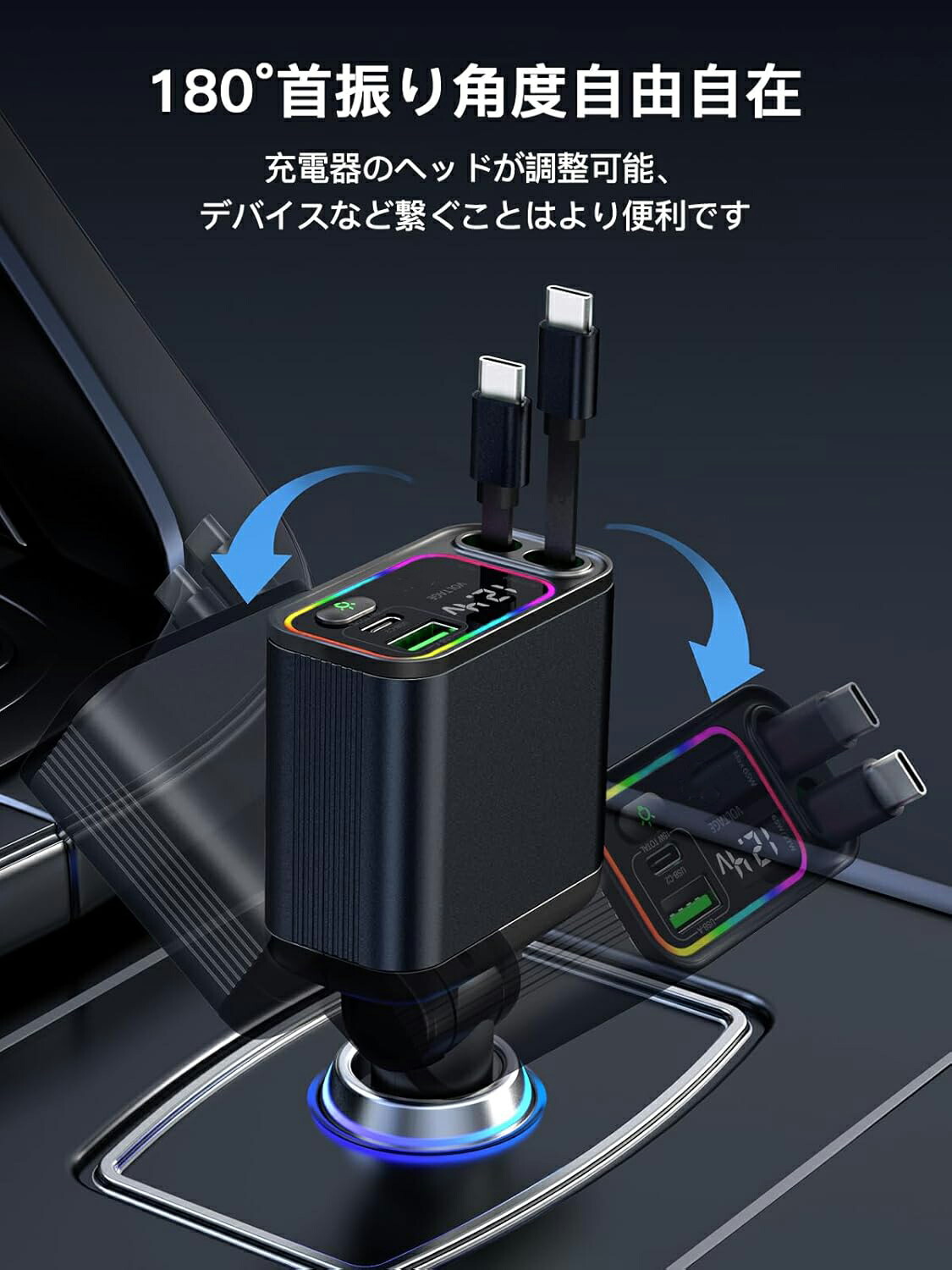 【便利な巻き取り式ケーブル 方向調整可能】シガーソケット車載充電器 USB-A、USB-C、Type-Cケーブルを内蔵し、最大80cmまで伸縮可能です。巻き取り式のデザインはケーブル収納の悩みを解決します。ケーブルの収納の手間がかかりません、持ち運ぶ時も邪魔になりません。巻き取り式充電ケーブル 120°方向可能な機能により、ケーブルをどの方向にも向けることができ、デバイスの接続や充電が簡単に行います。