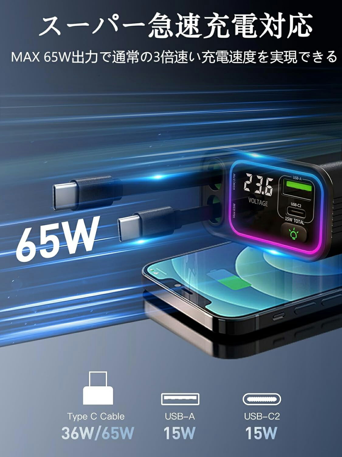 【四台のデバイス同時に充電】シガーソケット車載充電器、二つのポート(USB A + USB C)と2本の巻き取り式ケーブル(Type-C + USB-C)で、4台のデバイスの同時充電が可能です。109Wの強力な出力で、このシガーソケット usb効率的な充電を提供します。カーチャージャーには2本のType-Cケーブルが内蔵し、単独は最大36Wの電力を出力できる、同時に使用は合計最大65Wの電力を出力可能です。24V入力時には(一般的にトラックのシガーライターソケットで使用される)、USB-Cケーブルは最大65Wです。旅行中もすべてのデバイスの電源が確保されます。車内に散らばる複数の充電器に別れを告げ、一台の巻き取り式シガーソケットカーチャージャーで充電の必要性を簡略化しましょう。
