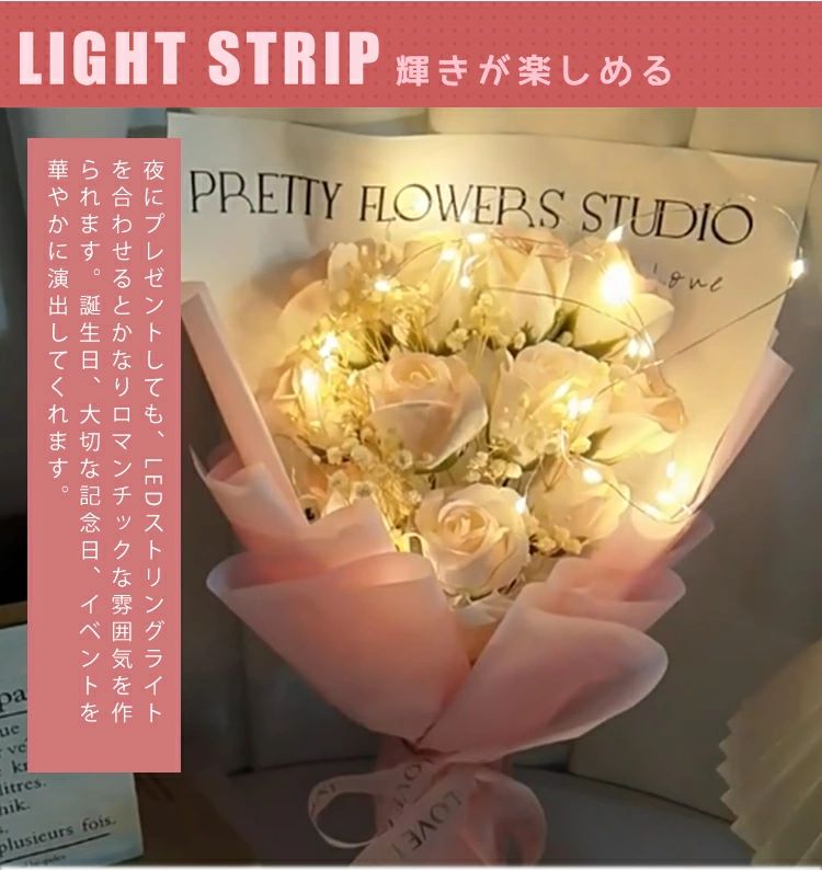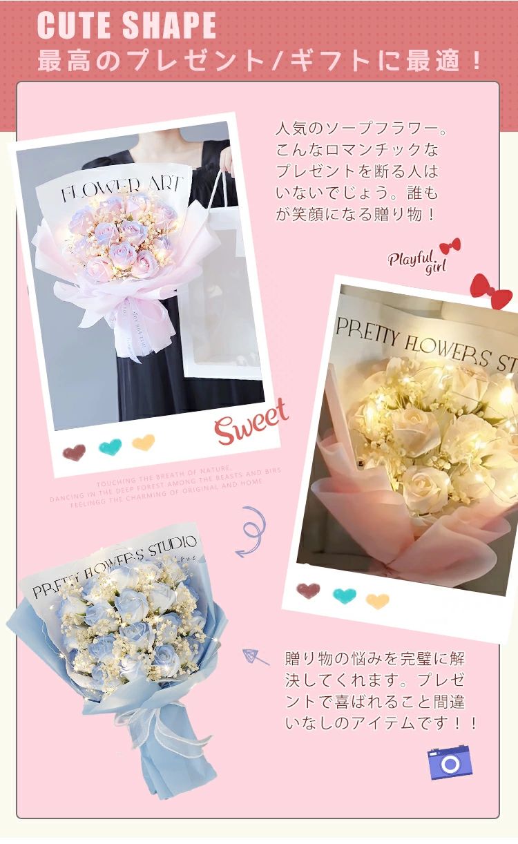 ソープフラワー 花束 卒業 フラワーギフト プレゼント ブーケ LEDライト付き 可愛い バラ 誕生日 イベント お祝い 贈り物 造花 枯れない 花 スタンディング 発表会 成人式 入学式 記 卒業式