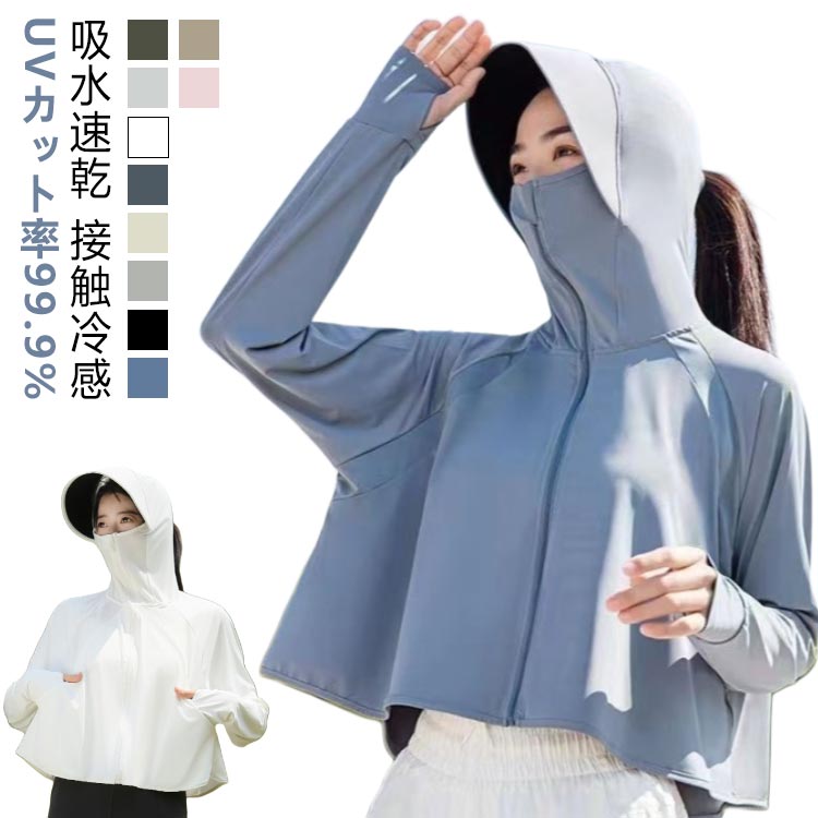 UVカット パーカー ショート ポンチョ UV 冷感 UPF50+ レディース 長袖 ショート丈 ラッシュガード UVカット率99.9% マスク 指穴 手袋 つば 大きめ トップス アウター つば広