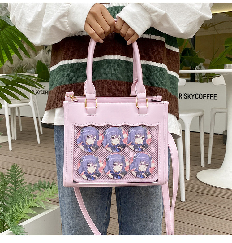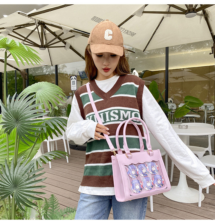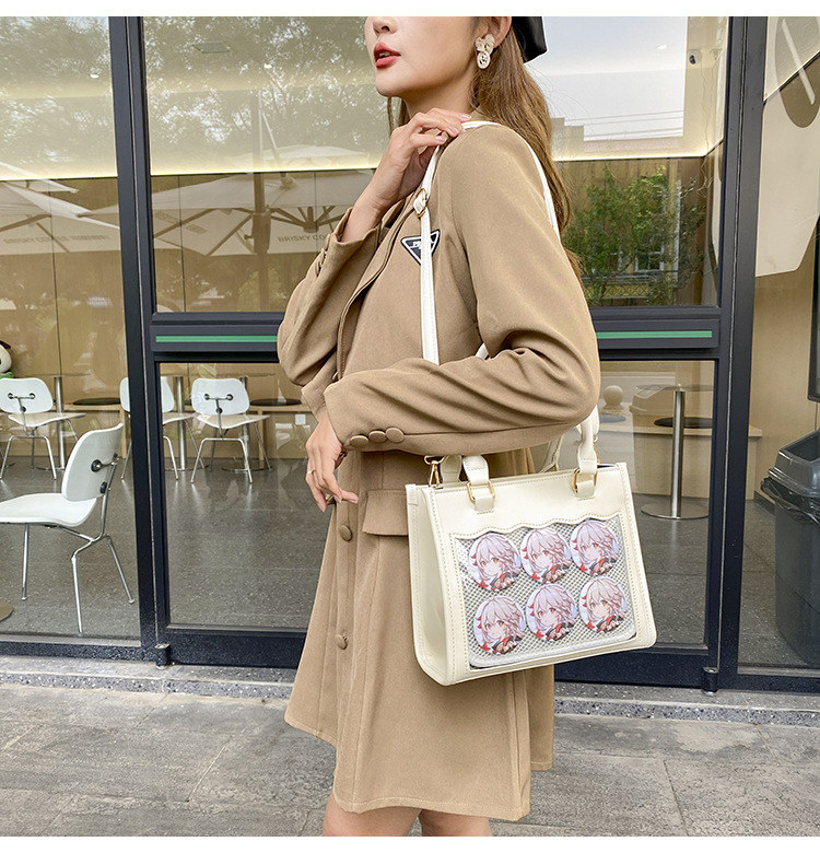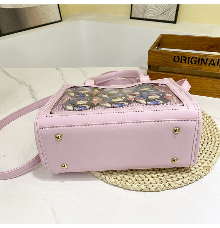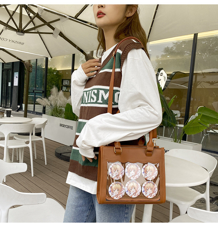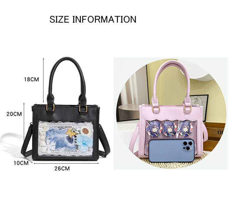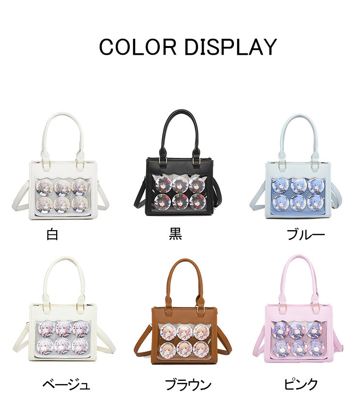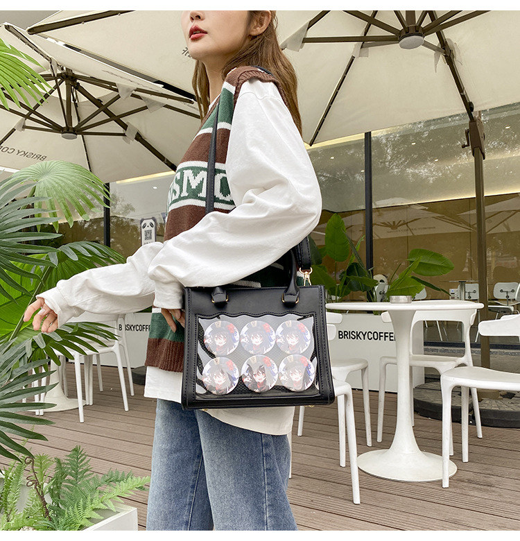 前の透明カバーに飾り板が入っていて、自分の好きな小物を入れることができるバッグです。 好きな芸能人や、アニメの写真 、缶バッジ、ストラップ、キーホルダーなどを入れるだけで、簡単に世界で1つたったのオリジナルバッグの完成です、毎日楽しく使える。