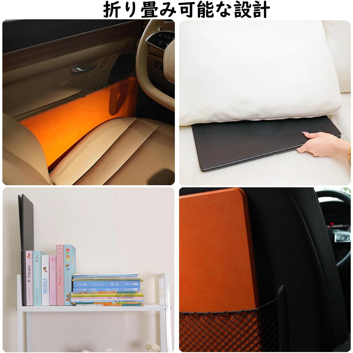 【多機能車用テーブル】この車用テーブルの高さは19 cmと21.8 cm自由に調整可能で、ベッド、ソファ、膝の上に置くことができる。テーブルだけではなく、ノートスタンドとしても利用できます。