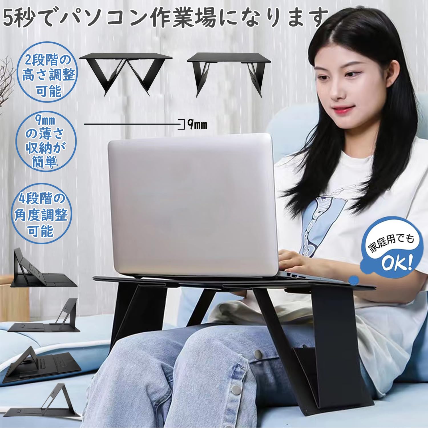 【折り畳み可能な設計】折り畳み可能な設計により、使わない時9mmに折り畳んで、タブレットのように本棚、机、車のトランクや後部座席に収納でき、場所を取りません。組み立ては折りたたみ線に沿って開くだけなのでとても簡単です。わずか5秒でパソコン作業を始められます。