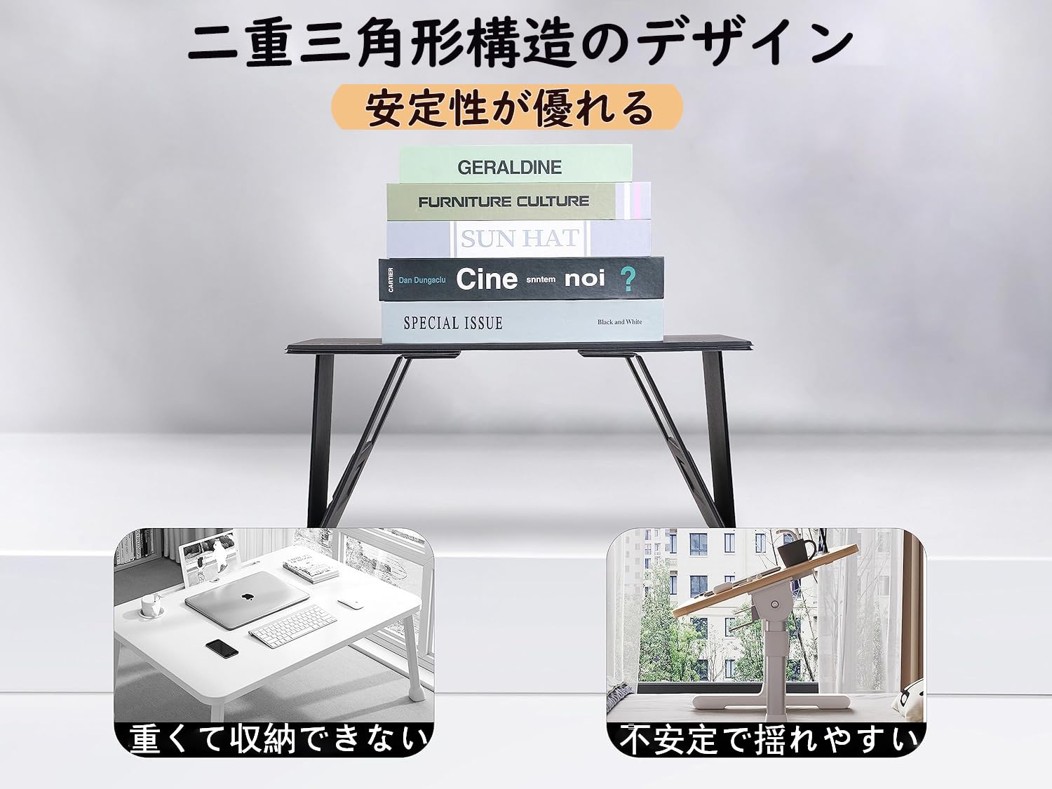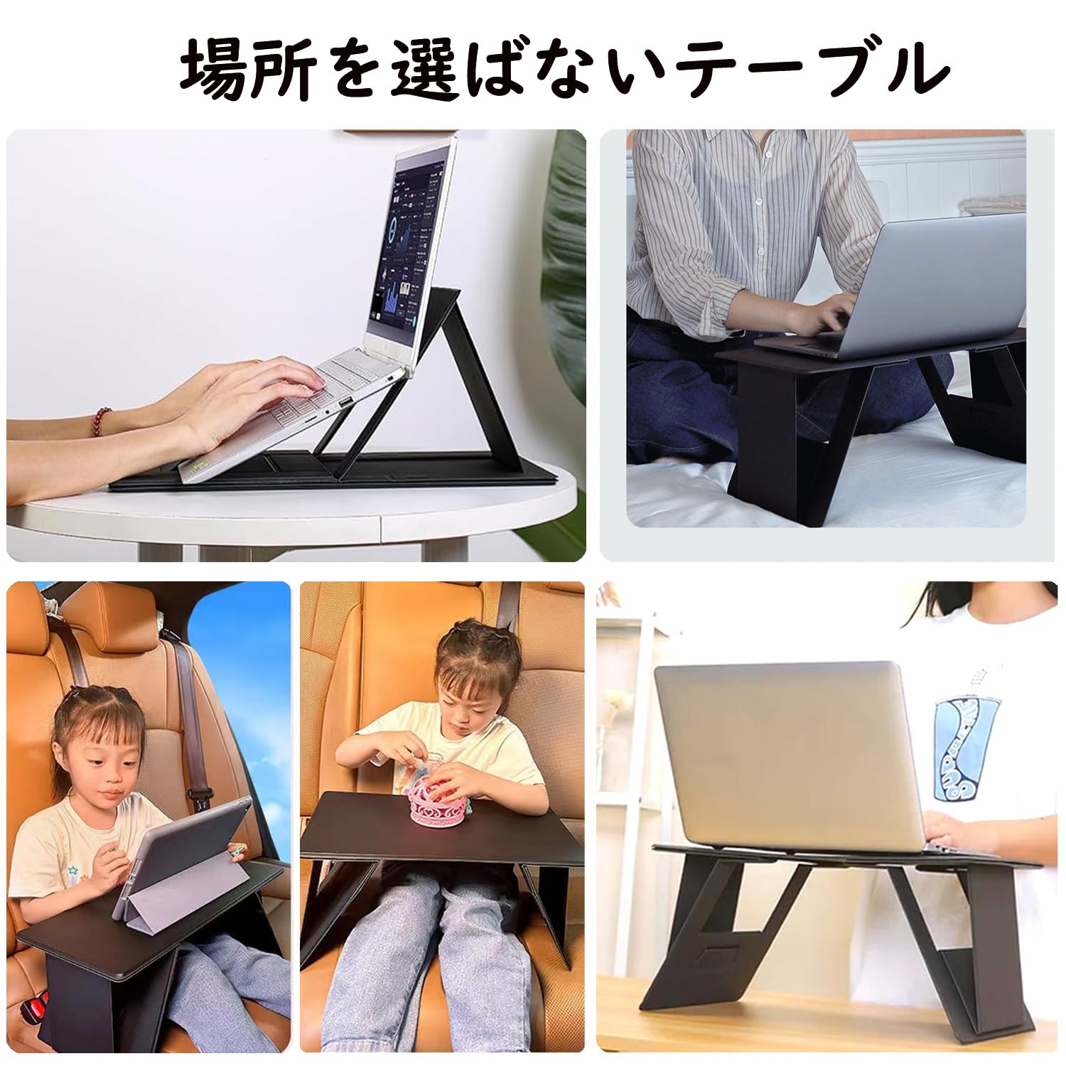 【場所を選ばないテーブル】この折り畳みテーブルはソファ、ベッド、デスク、カフェ、車など、どこでも使えます。椅子に座れば膝に置け、立てばテーブルに置けるので、どこでも便利に使えます。特に長時間のドライブや出張に最適で、長時間机に向かう時の姿勢改善にも役立ちます。