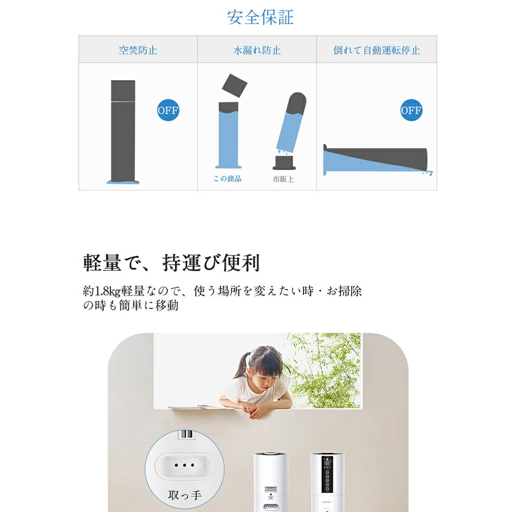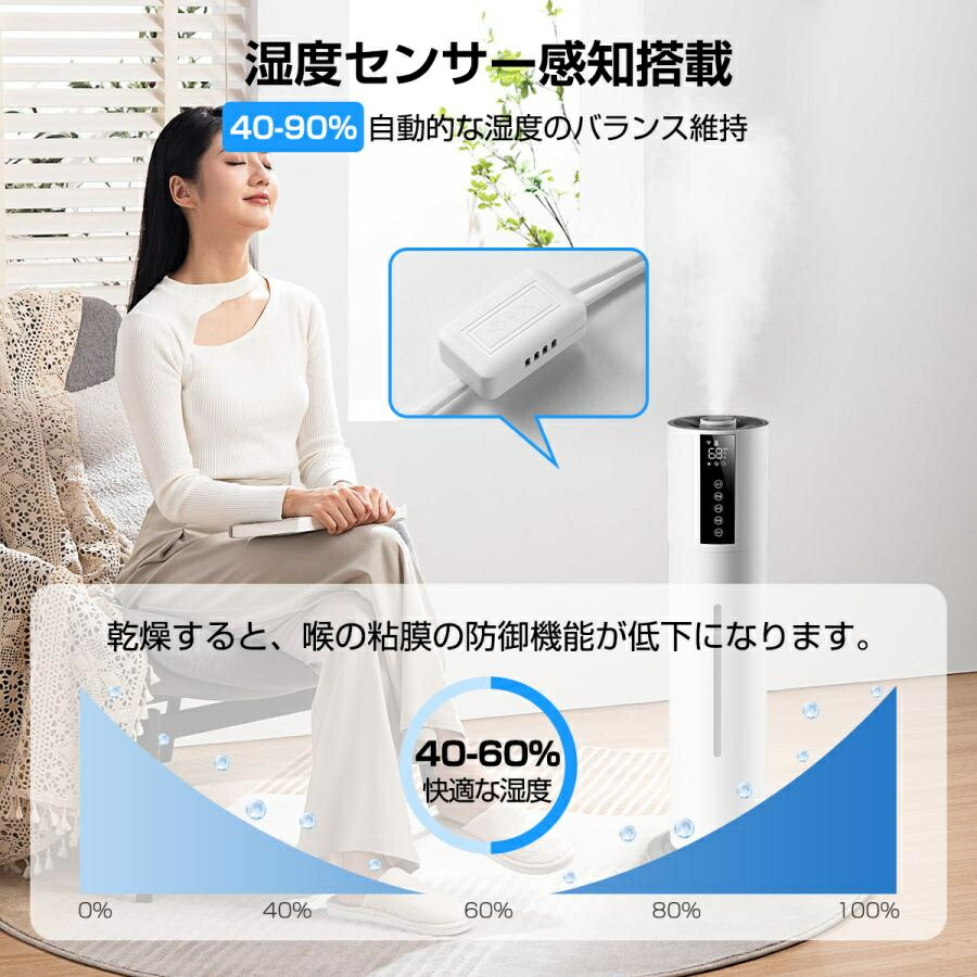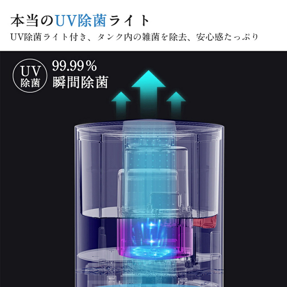 超ポイントバック祭開催中 限定P10倍 加湿器 大容量 8L 除菌 タワー型加湿器 次亜塩素酸水対応 4重除菌 超音波加湿器 UV除菌 上から給水 お手入れ簡単 空焚き防止 湿度センサー
