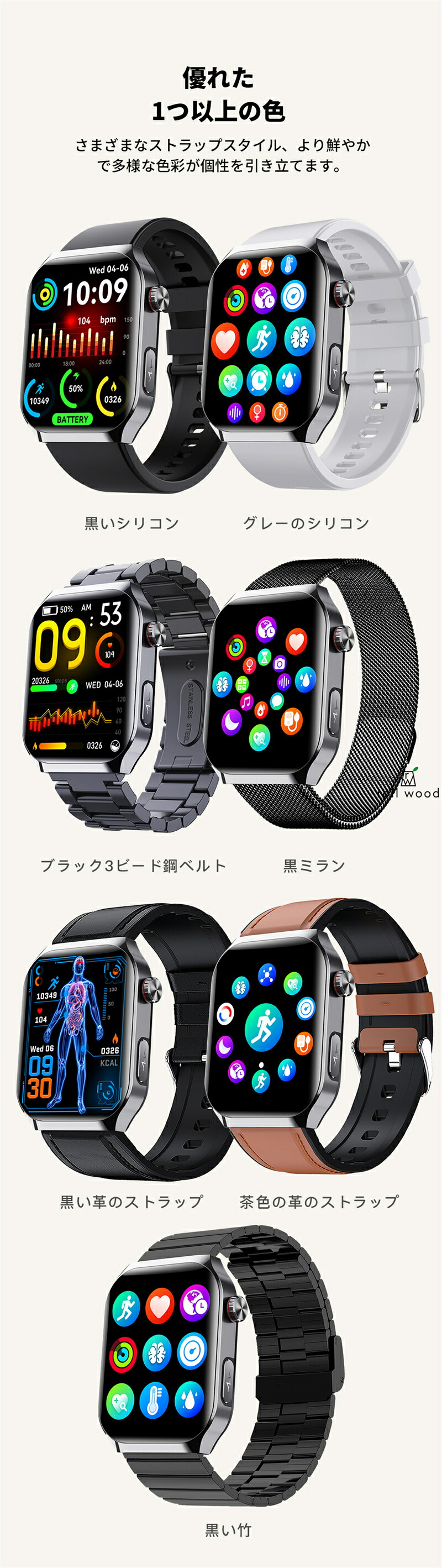 スマートウォッチ 日本製センサー SO ブラック(シリコン) グレー(シリコン) ブラック(ステンレス) ブラック(ミラン) ブラック(レザー) ブラウン(レザー) 黒竹