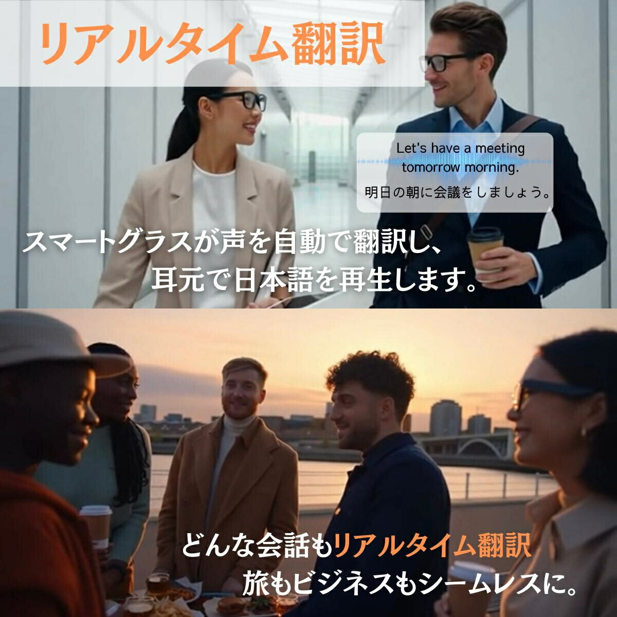 Bluetooth メガネとして、高音質なサウンドを耳元に届けます。ノイズリダクション機能により、クリアな通話が可能。さらに、リアルタイム翻訳機能を搭載し、声を自動で翻訳して目元に表示。旅もビジネスもシームレスに。メガネ型イヤホンとして音楽や通話を楽しみながら、スマートグラス iPhone対応でどこでも接続が途切れません。