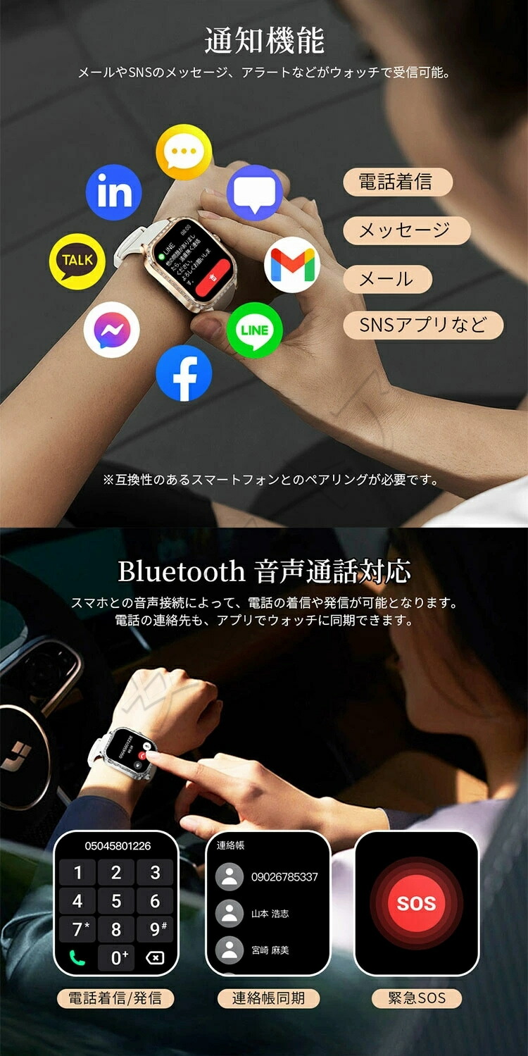 マイクとスピーカーが本体に内蔵されているため、スマートフォンとのBluetooth接続で、スマートウォッチで直接通話・着信拒否・受発信することができ、連絡帳や通話履歴の表示もできます。