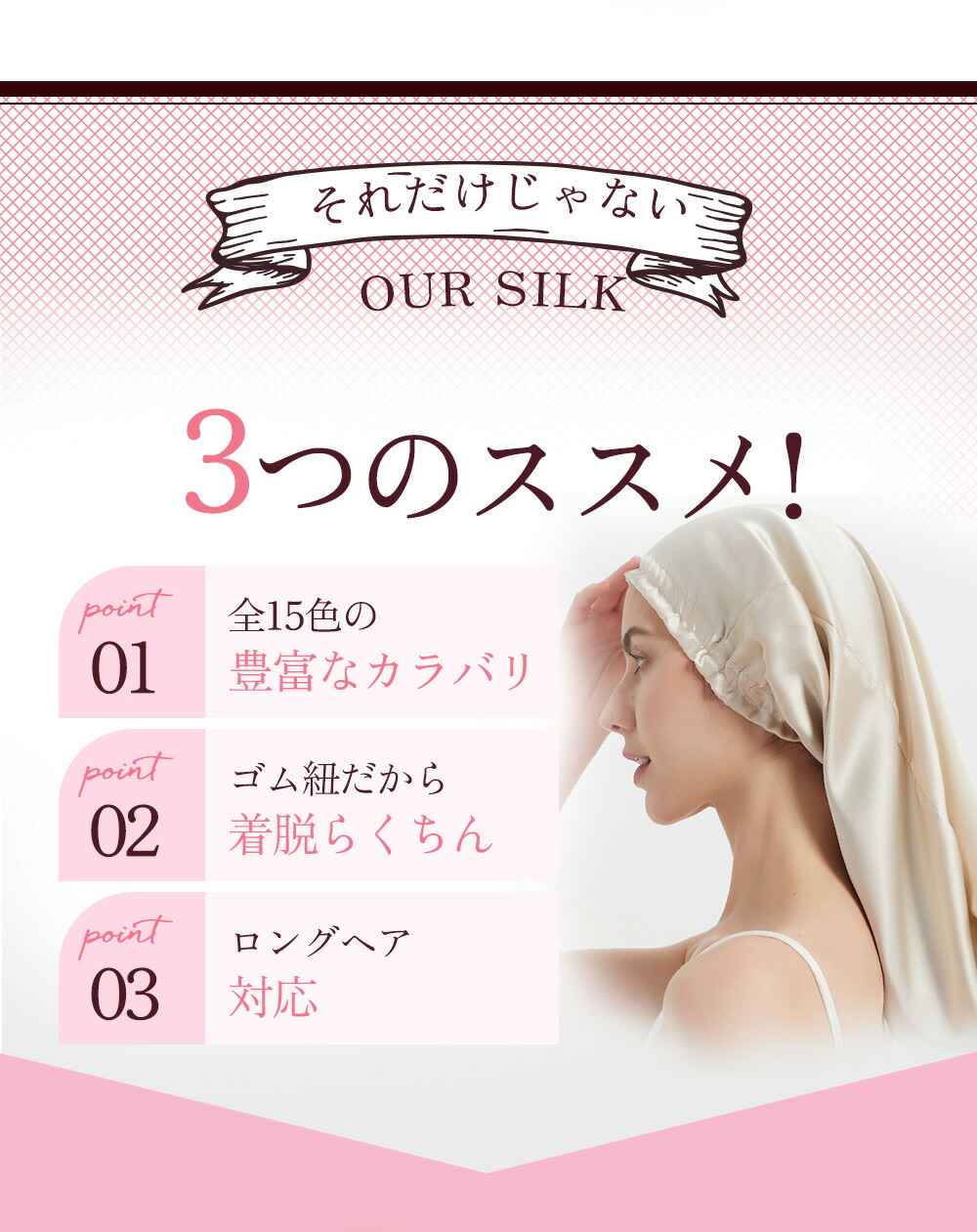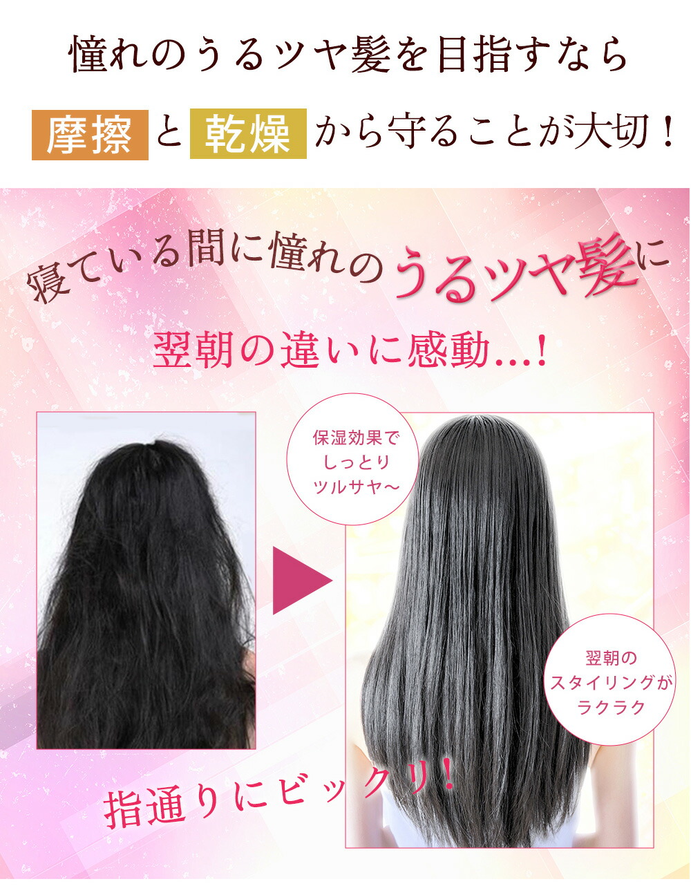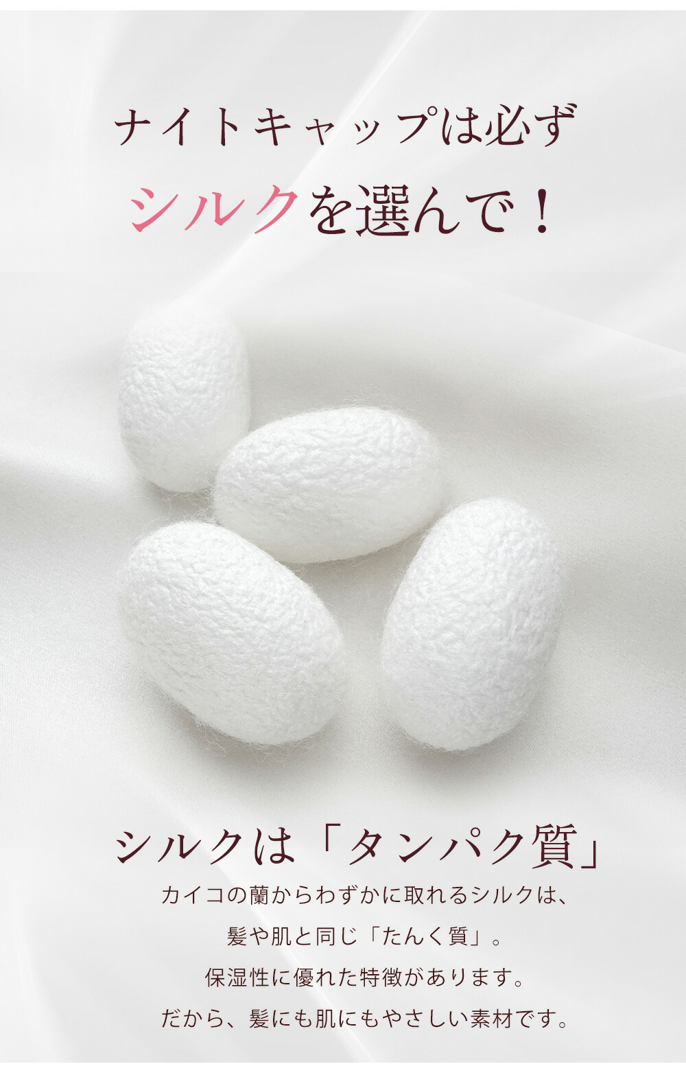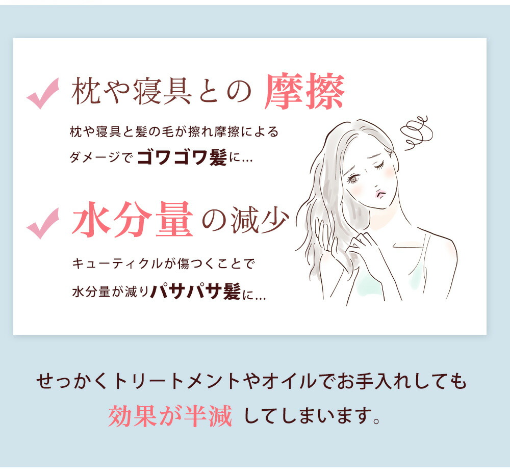 【なぜ髪が潤う 】寝ている間の頭皮の乾燥や摩擦は、髪に大きなダメージを与えています。 ナイトキャップ は優れた保湿性や通気性で髪に潤いを補給。ドライヤーの熱や紫外線などで傷んだ髪をケアし、うる艶髪を実現します。
