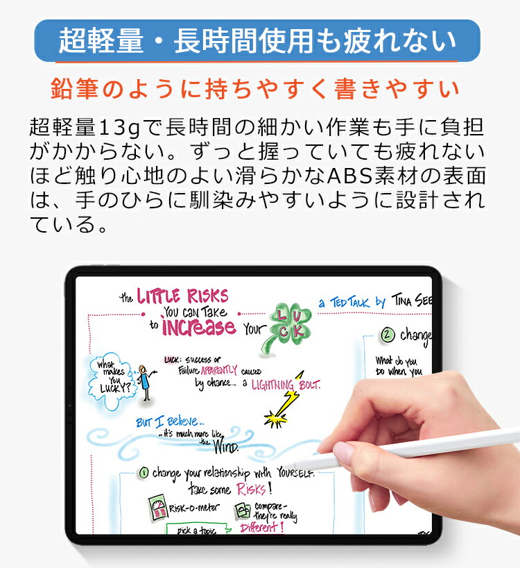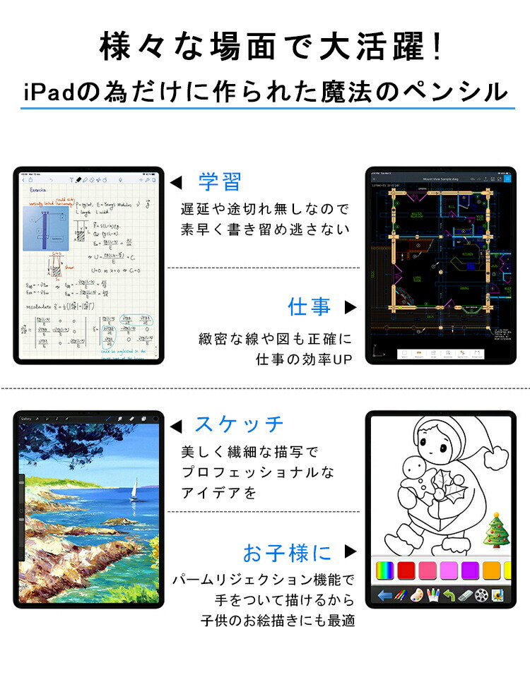 iPad専用に設計されているため、使用する際のラグが少なく、精度も他の汎用型タッチペンより60%ほど高くなっています。絵描き、書き込み、スケッチ、イラストなどをスムーズに描けます。