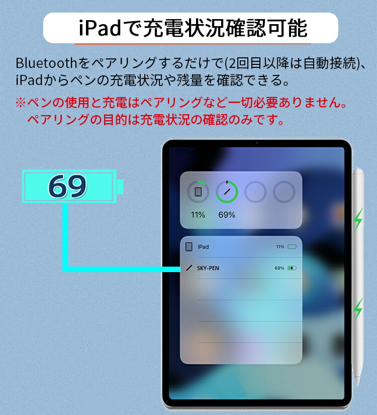 さらに、本製品はBluetoothペアリングをしていただくとiPad画面からペンの充電状況を確認することもできます。