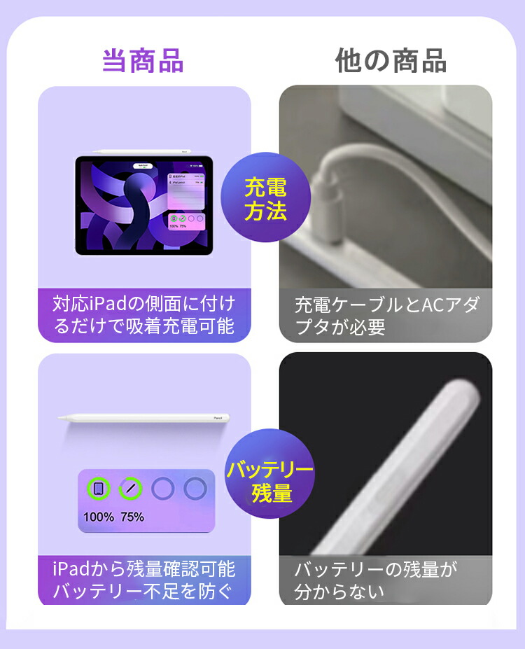 iPadの側面に吸着するだけでワイヤレス充電ができます。充電忘れの心配はもういりません!