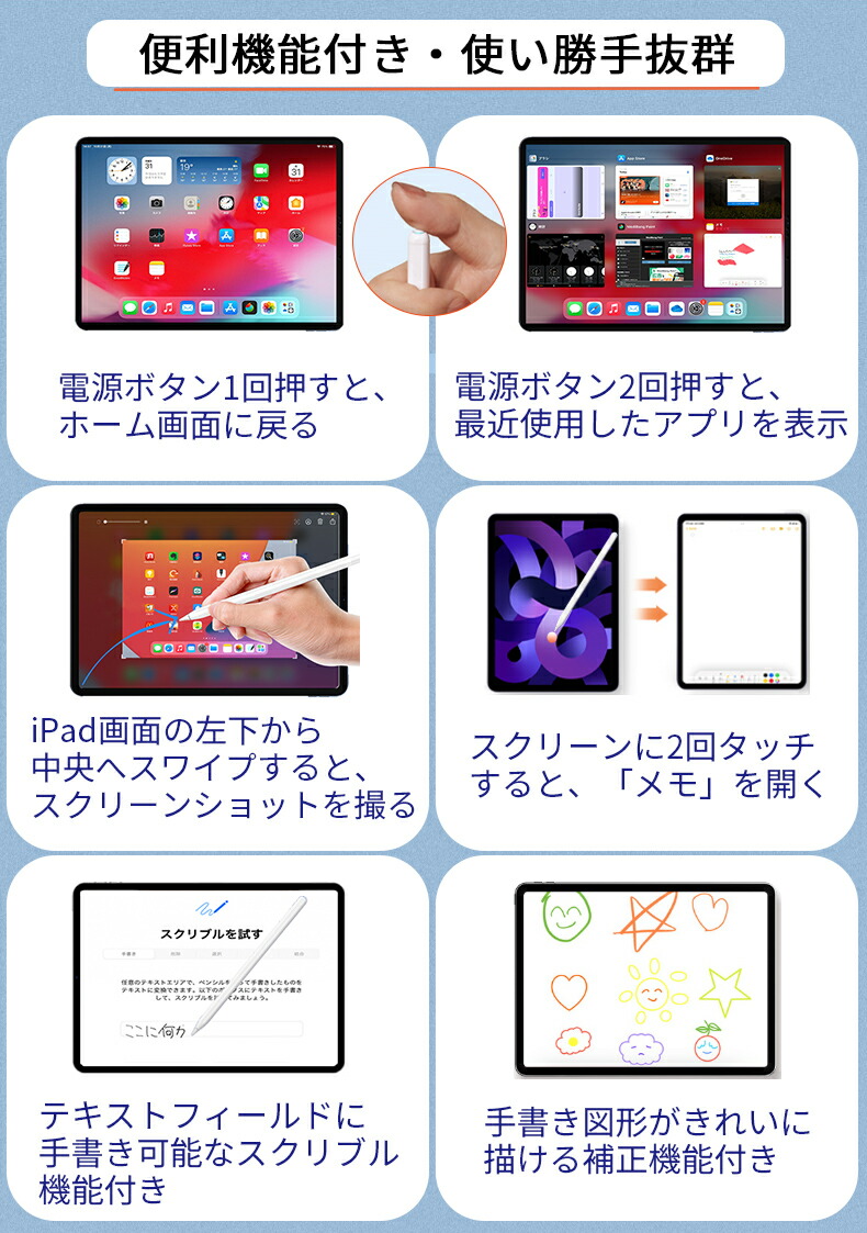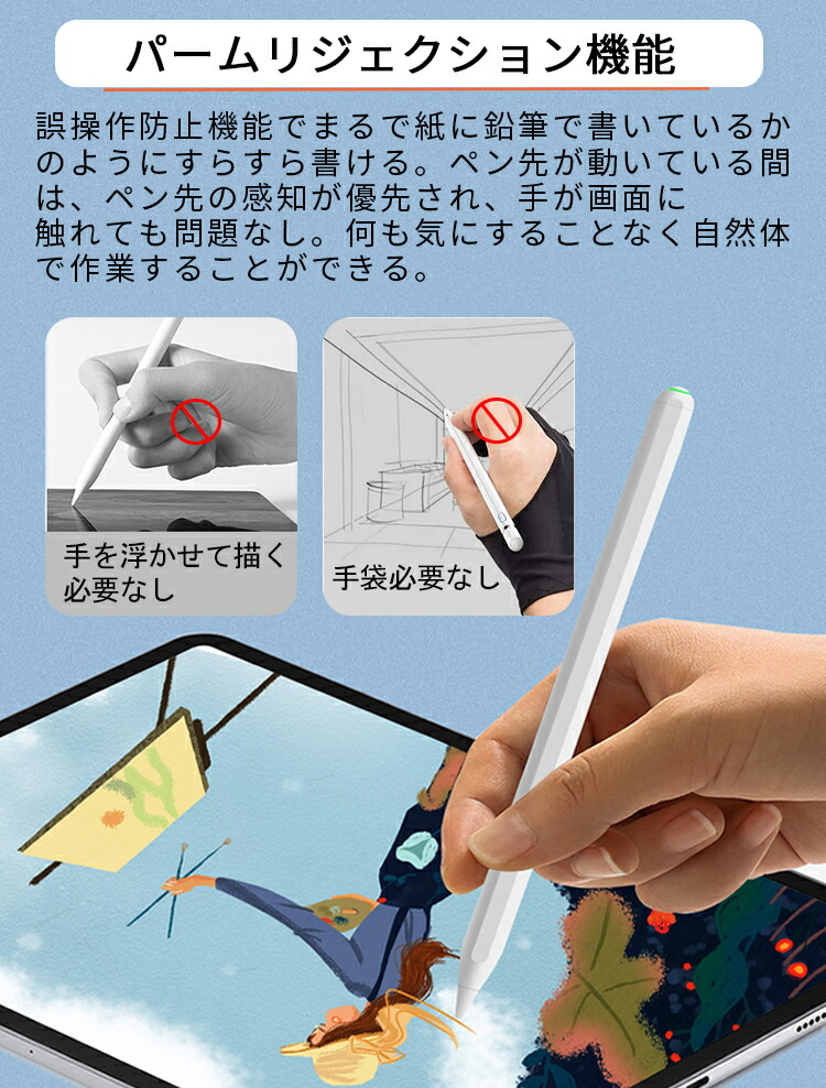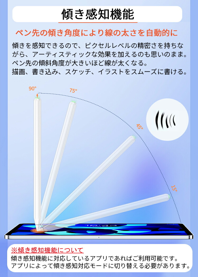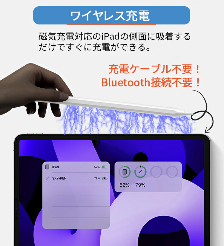 【磁気吸着充電/バッテリー残量表示/傾き感知機能/パームリジェクション機能/途切れ無し/遅延無し/ズレ無し/誤操作防止】iPad タッチペン ワイヤレス充電 極細 ペンシル スタイラスペン ペン先1.0mm 超高感度/高精度 超軽量 iPad Air4 Air5 mini6 iPad Pro 11インチ 12.9インチ Bluetoothペアリング不要 自動電源OFF