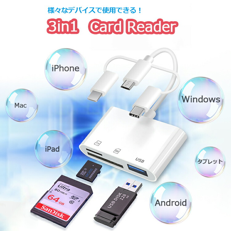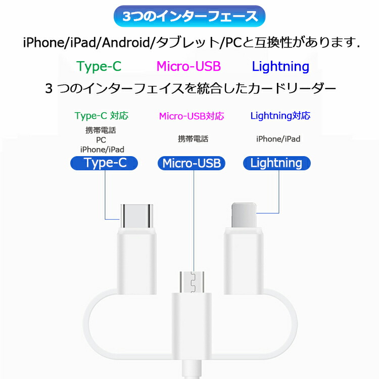 Lightning/Type-C/ Micro-USB 3つのインターフェイスを統合したカードリーダー。iPhone/iPad/Android/Chrome/Mac/タブレット/PCなどのデバイスに対応可能。