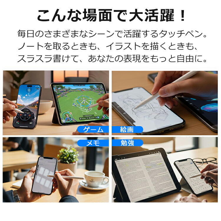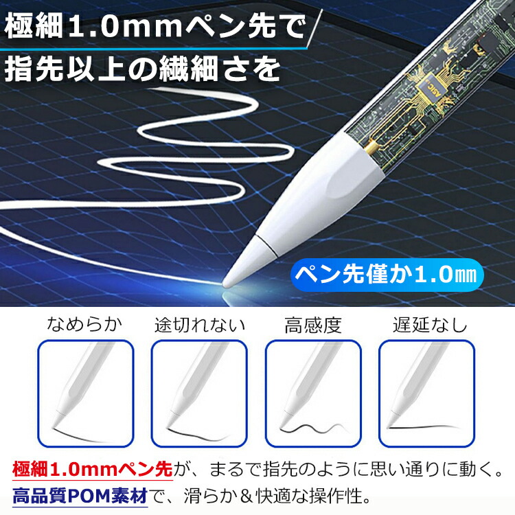 丸みのあるペン先は直径1.0mmと極細で、材質は純正のアップルペンシルと同じPOM素材を採用し、画面に傷つきにくい。手書きメモ、ツムツムなどのゲームまでいろいろな用途で大活躍できます。