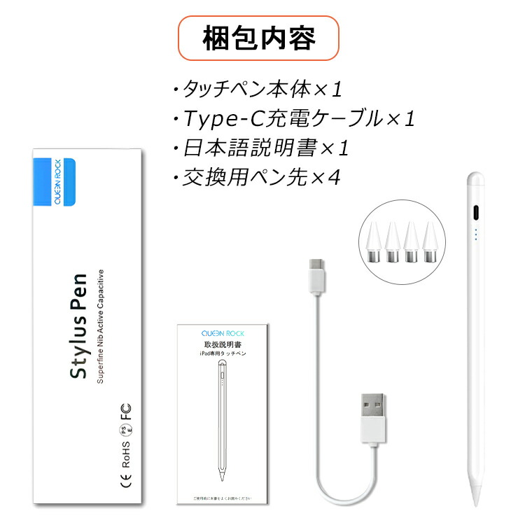 Type-C充電ケーブル、交換用ペン先*4個、日本語取扱説明書