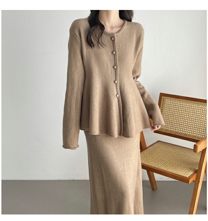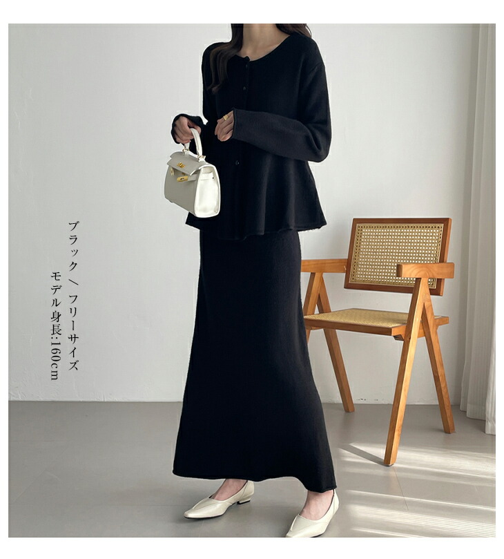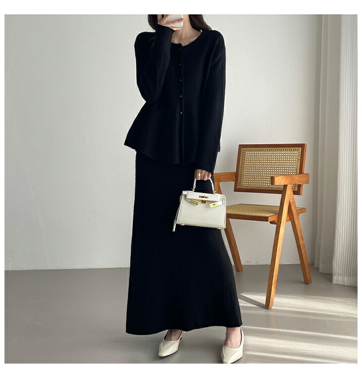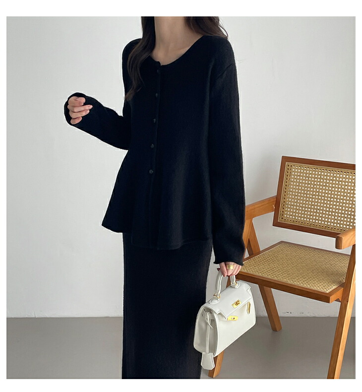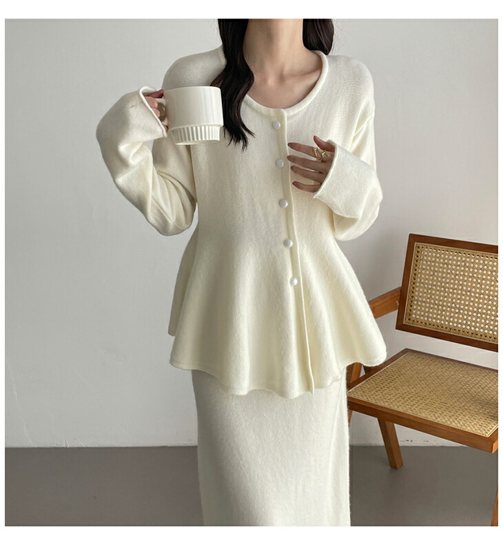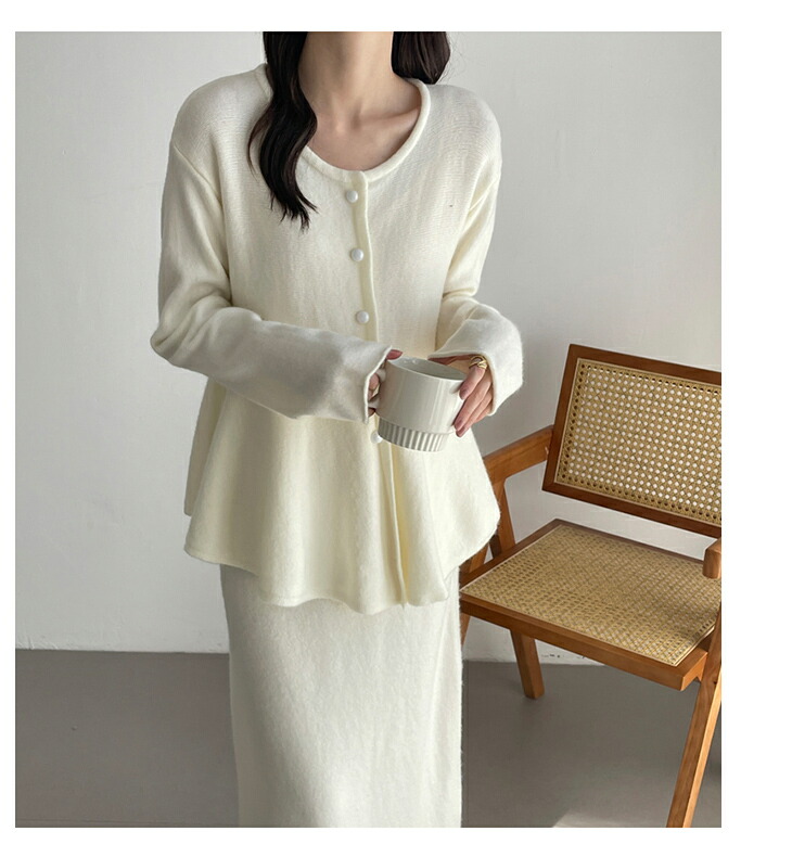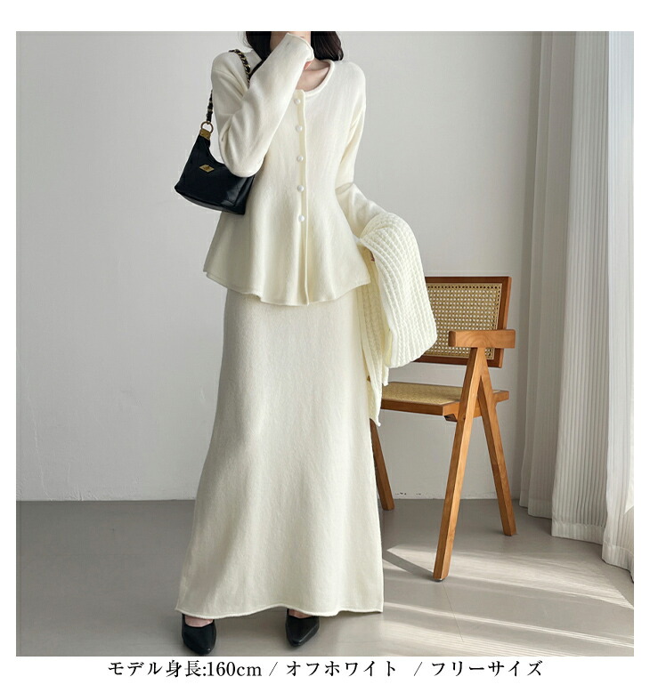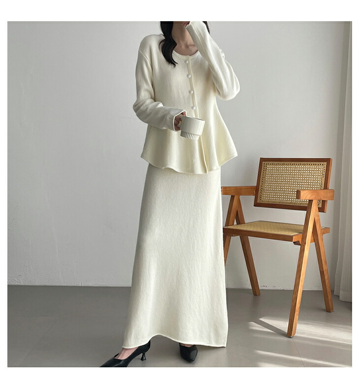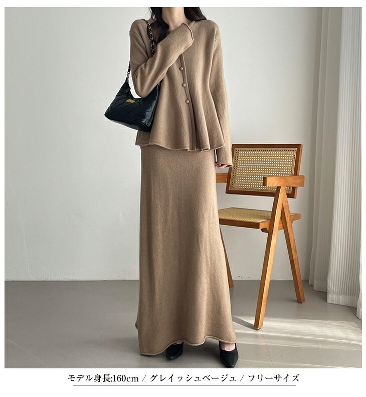 前ボタン付きトップス&ロングスカートセ レディースファッション 豊富な品揃え グレイッシュベージュ オフホワイト ブラック