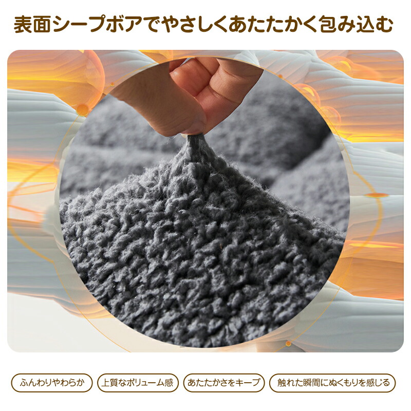 表面のシュコットンフリースはふんわりとした毛羽感のある仕上げで、一つ一つの繊維がまるで雲のように柔らかく、横になる瞬間に包み込まれるような暖かさを実感できます。内側に充填されたダウンコットンは、羽毛のようなふんわりとした弾力を再現し、「柔らかい支え + 深い包み込み」の二重体験を提供。寒い冬の夜でも、まるで優しい抱擁に包まれるように、肌から心まで温め、触れた瞬間に心地よく圧力を解放。毎回の横たわりが、心身を癒す至福の時間となります。