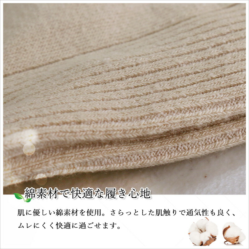 :肌にやさしい綿を使用し、さらっと快適な履き心地でムレにくく長時間でも快適です。