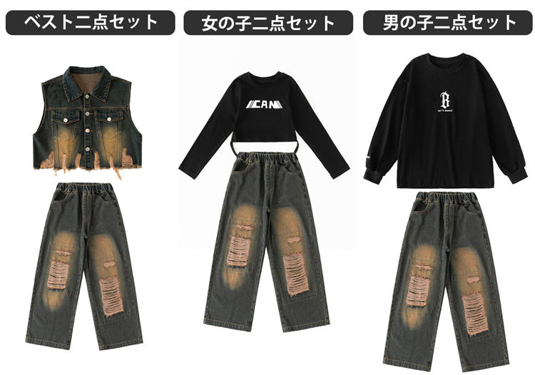 ダメージ デニム キッズダンス ヒップ キッズ スーツ カジュアルセットアップ カジュアルパンツセット 早い者勝ち 女の子三点セット 男の子三点セット ベスト二点セット 女の子二点セット 男の子二点セット 110 120 130 140 150 160 170 180