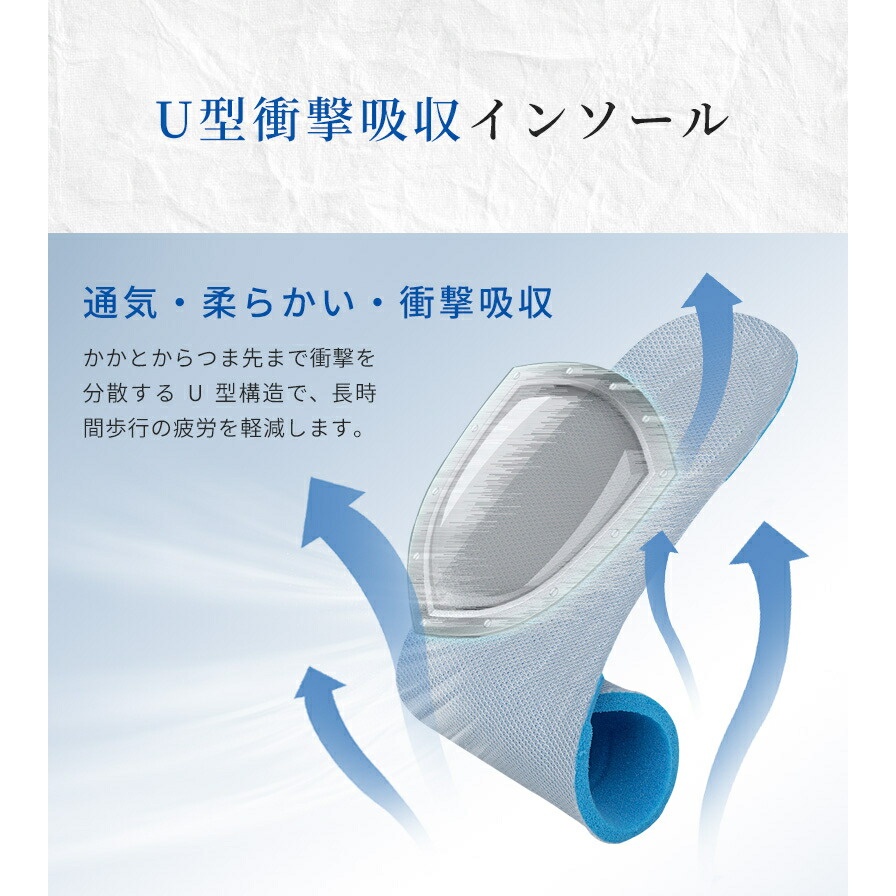 かかとからつま先まで衝撃を分散するU型構造で、長時間歩行の疲労を軽減します。
