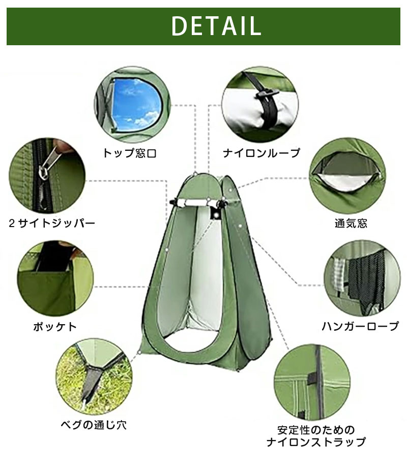 防風・防水・断熱のため、高品質な190Tポリエステル素材が採用されます。テントの素材全体は、プライバシーを保護するために不透明です。