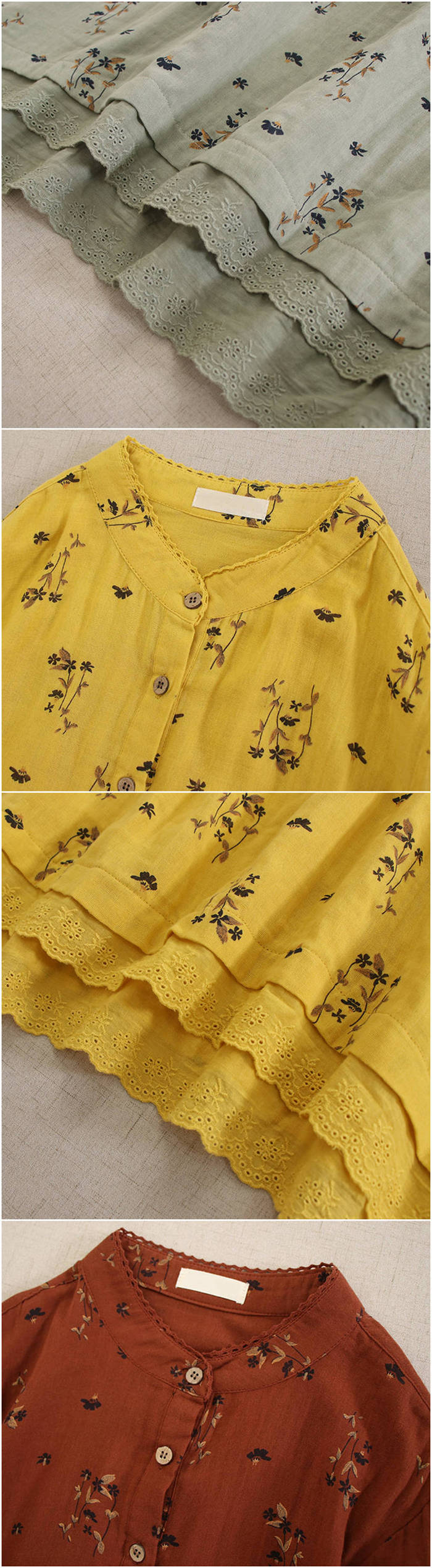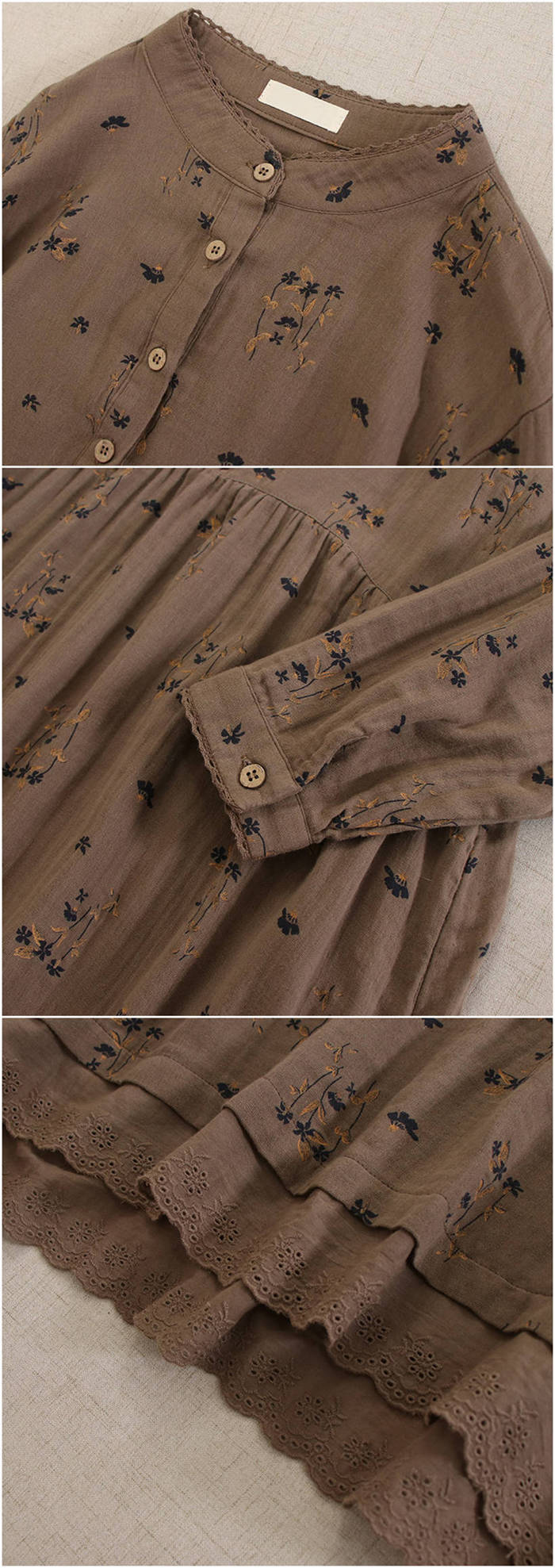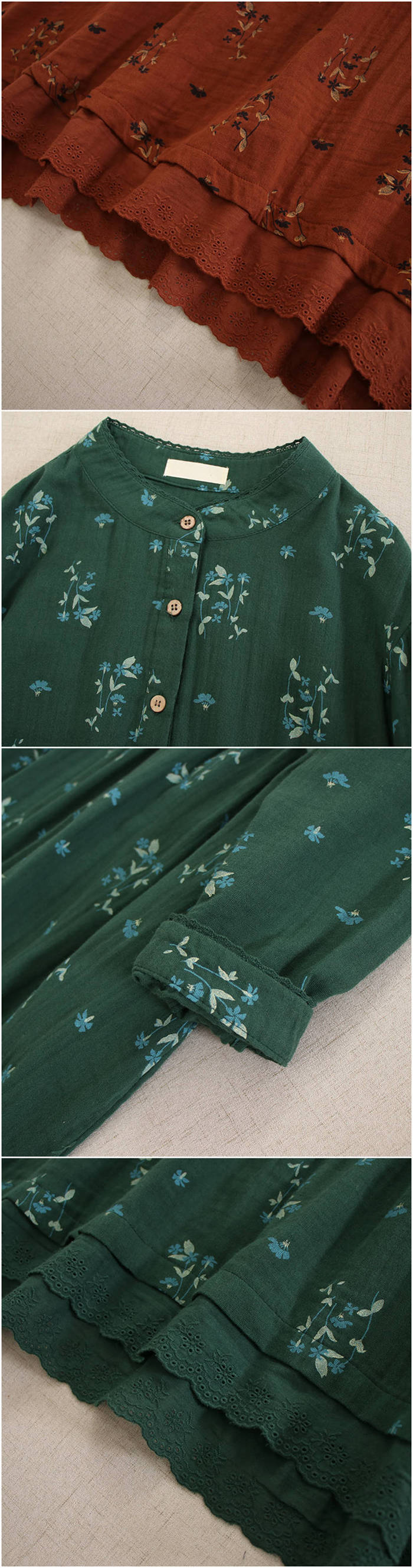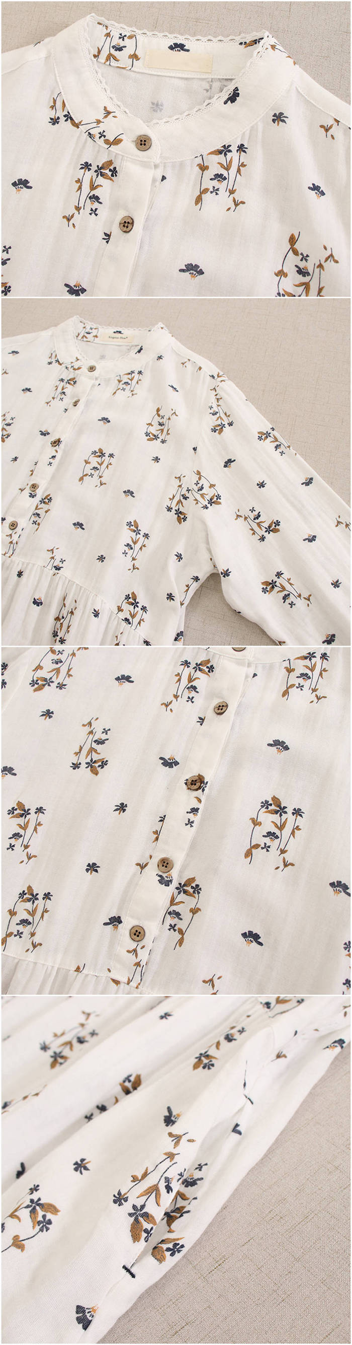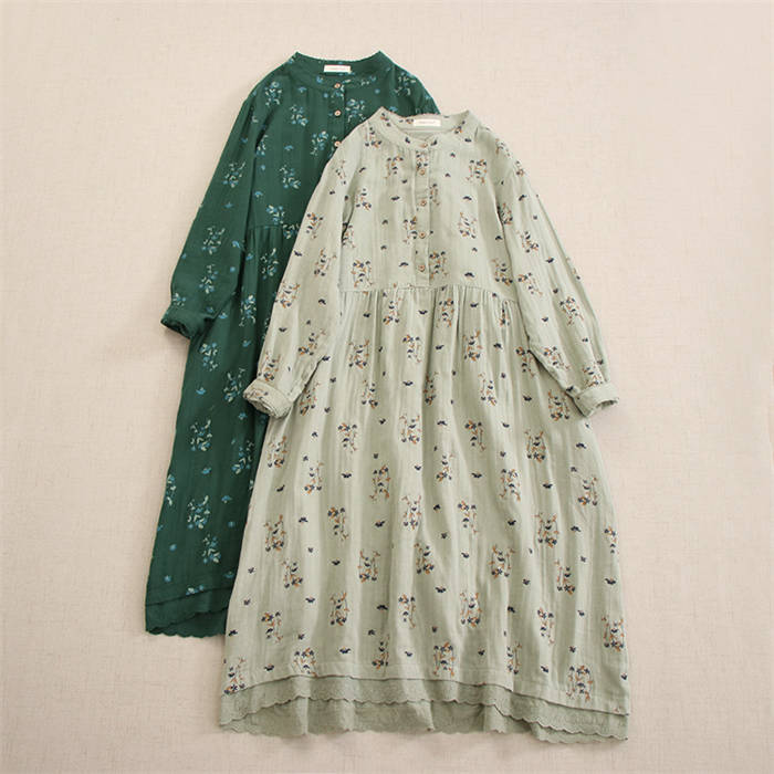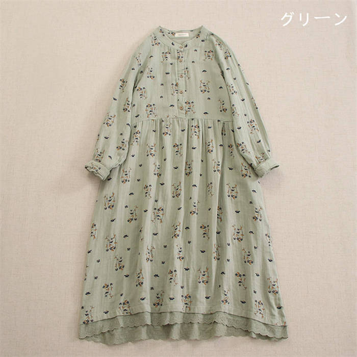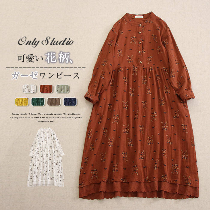 100%綿 2重ガーゼ ワンピース 花 レディースファッション 続々登場 ホワイト グリーン イエロー カラメル ダークグリーン コーヒー色 ネイビー