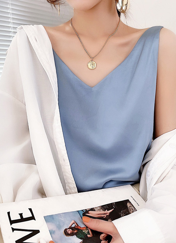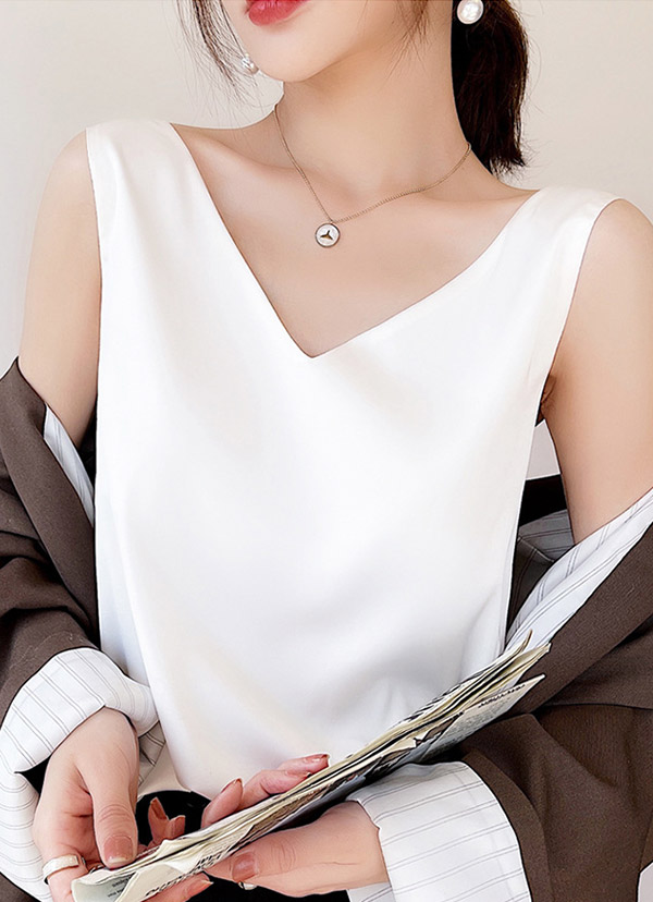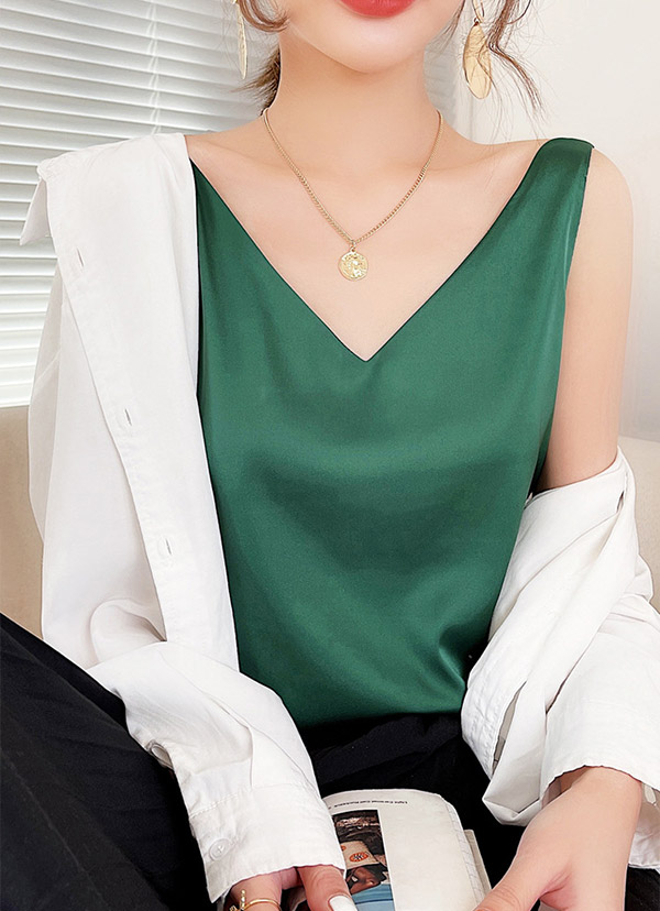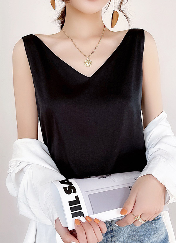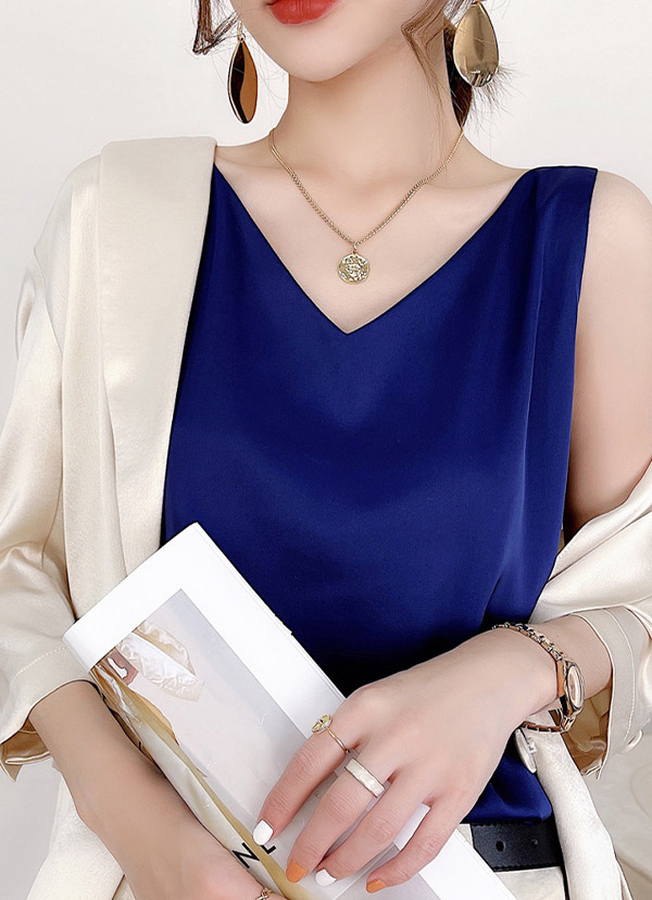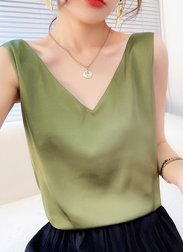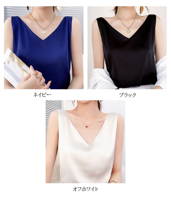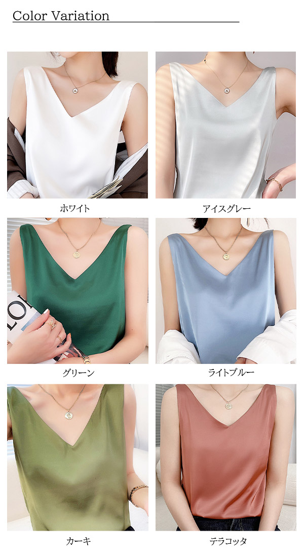 Vネック サテン ノースリーブ カット レディースファッション 特集 M(即納) L(即納) XL(即納) ブラック ホワイト オフホワイト ネイビー カーキ アイスグレー テラコッタ グリーン ライトブルー