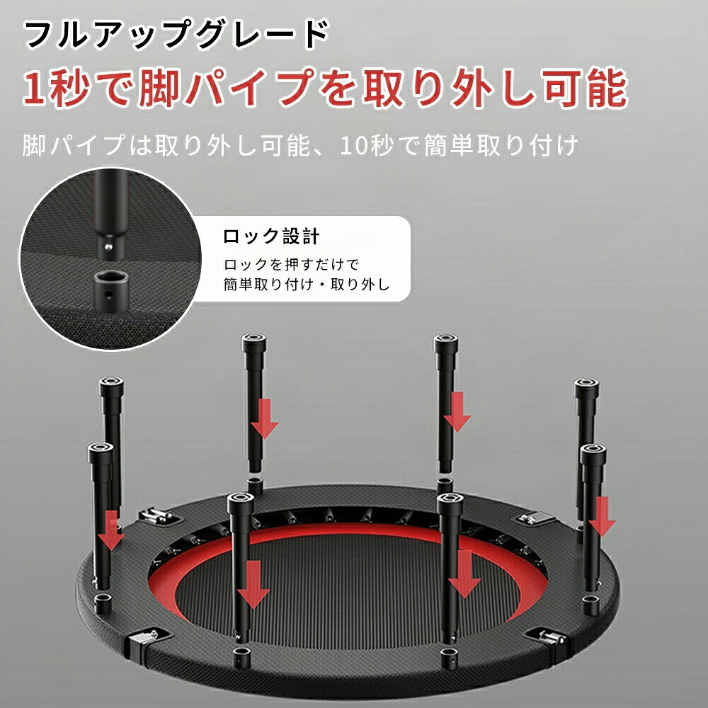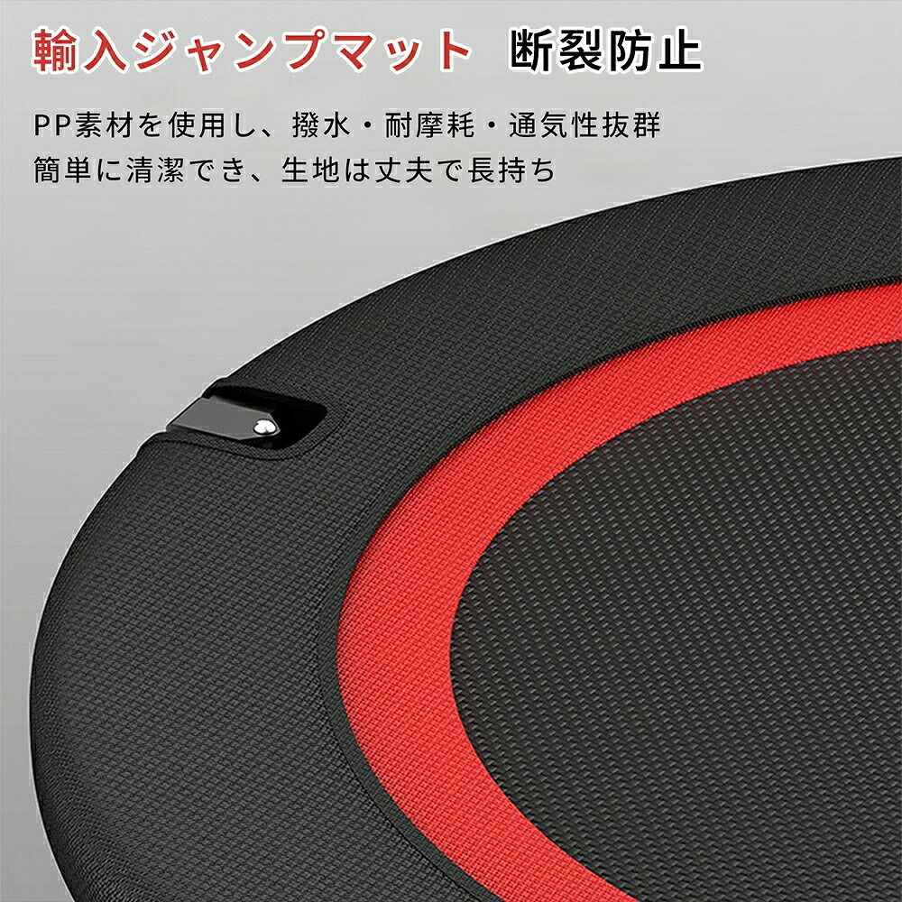 この室内トランポリンは、大人用としても子ども用としても使用可能です。約102cmの広い跳ね面は、楽しさだけでなく、活動力と体力向上にも役立ちます。