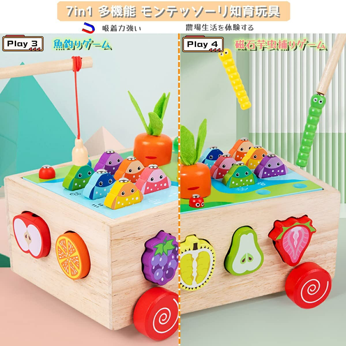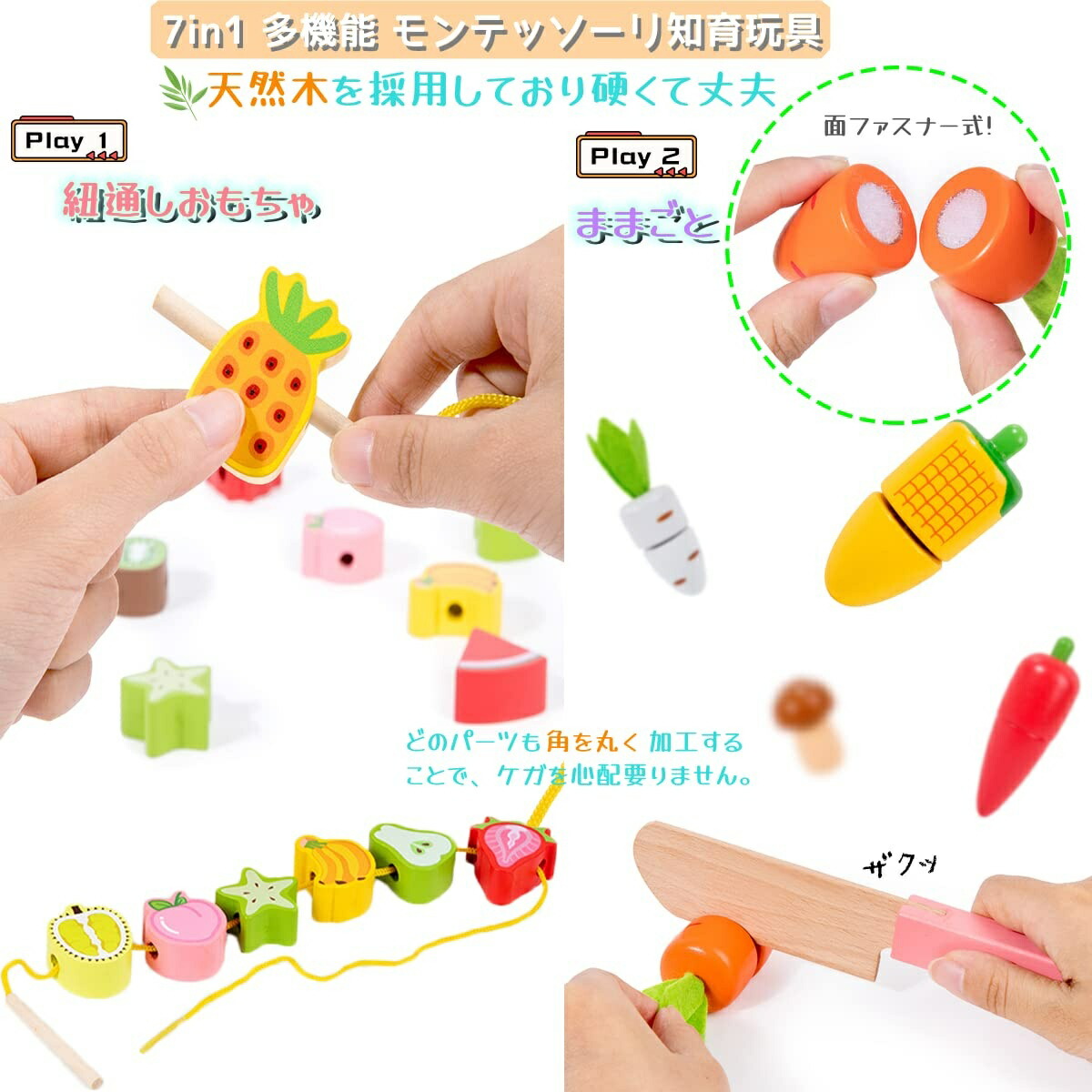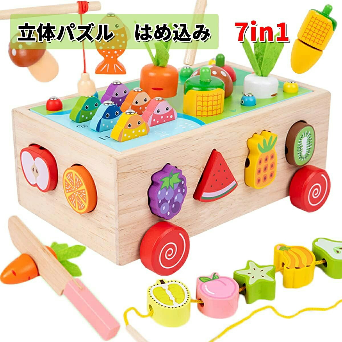 立体パズル 7in1 モンテッソーリ 教育玩具 型はめ 形合わせ はめ込み 指先を使う釣りおもちゃ 紐通しおもちゃ おままごとおもちゃもできる多機能木製おもちゃ 1 2 4歳知育玩具 女の子 男の 3