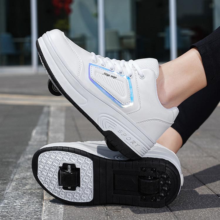 後輪ローラーは靴底に収納可能です。カカトのボタンを押したまま、ローラーを押せば収納できます。前輪ローラーは収納不可ですが、取り外しが可能です。付属のフタをはめ込めば通常履きのスポーツシューズとしても使用出来ます。