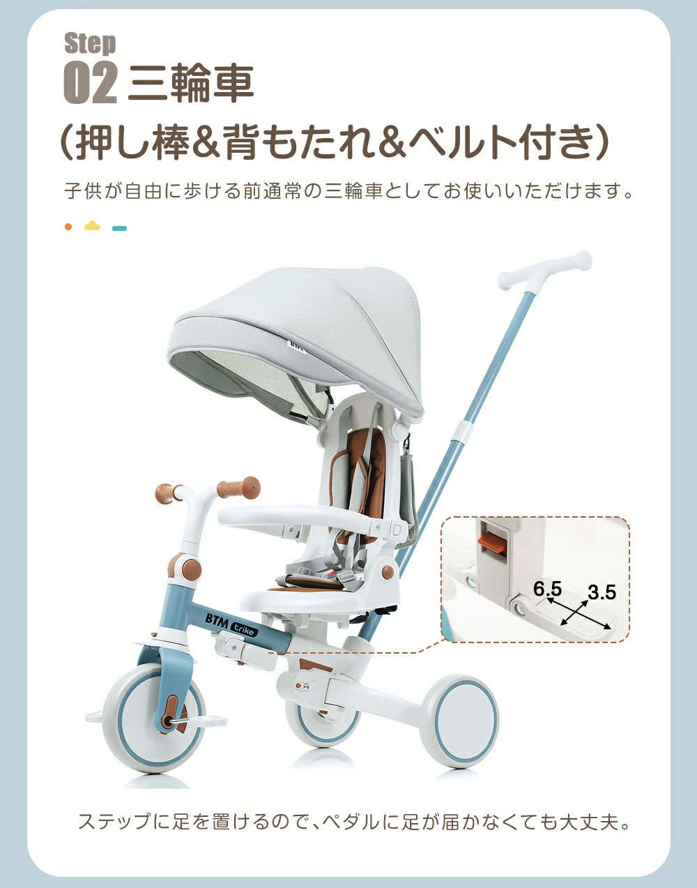 b.三輪車(押し棒&背もたれ&ベルト付き):1~2歳 子供が自由に歩ける前通常の三輪車としてお使いいただけます。 スデップに足を置けるので、ペダルに足が届かなくても大丈夫。