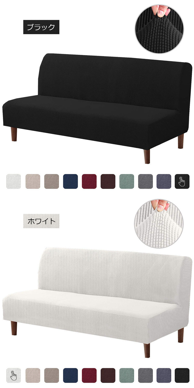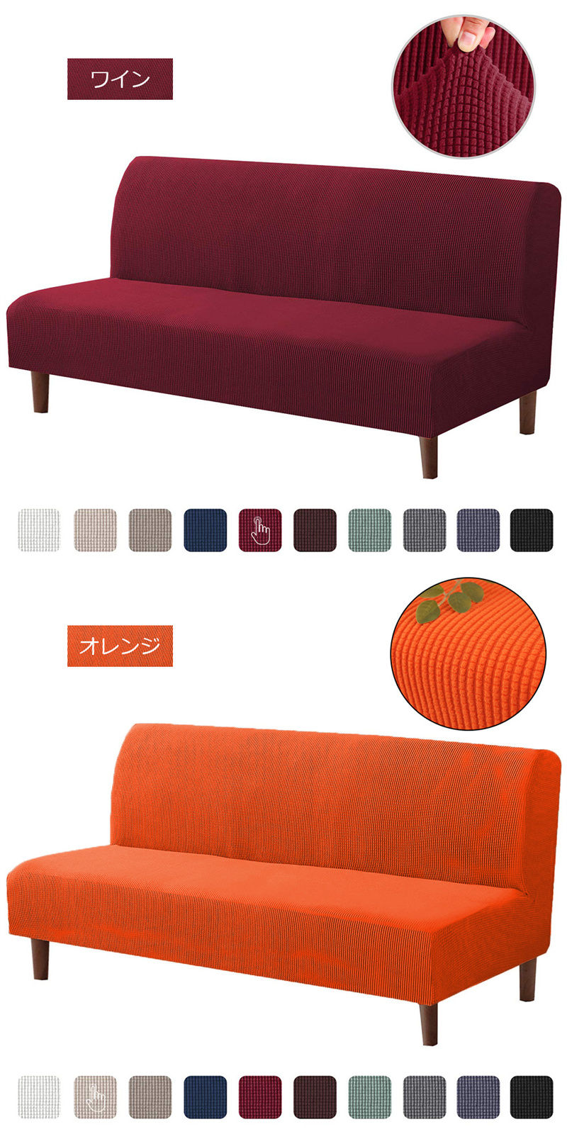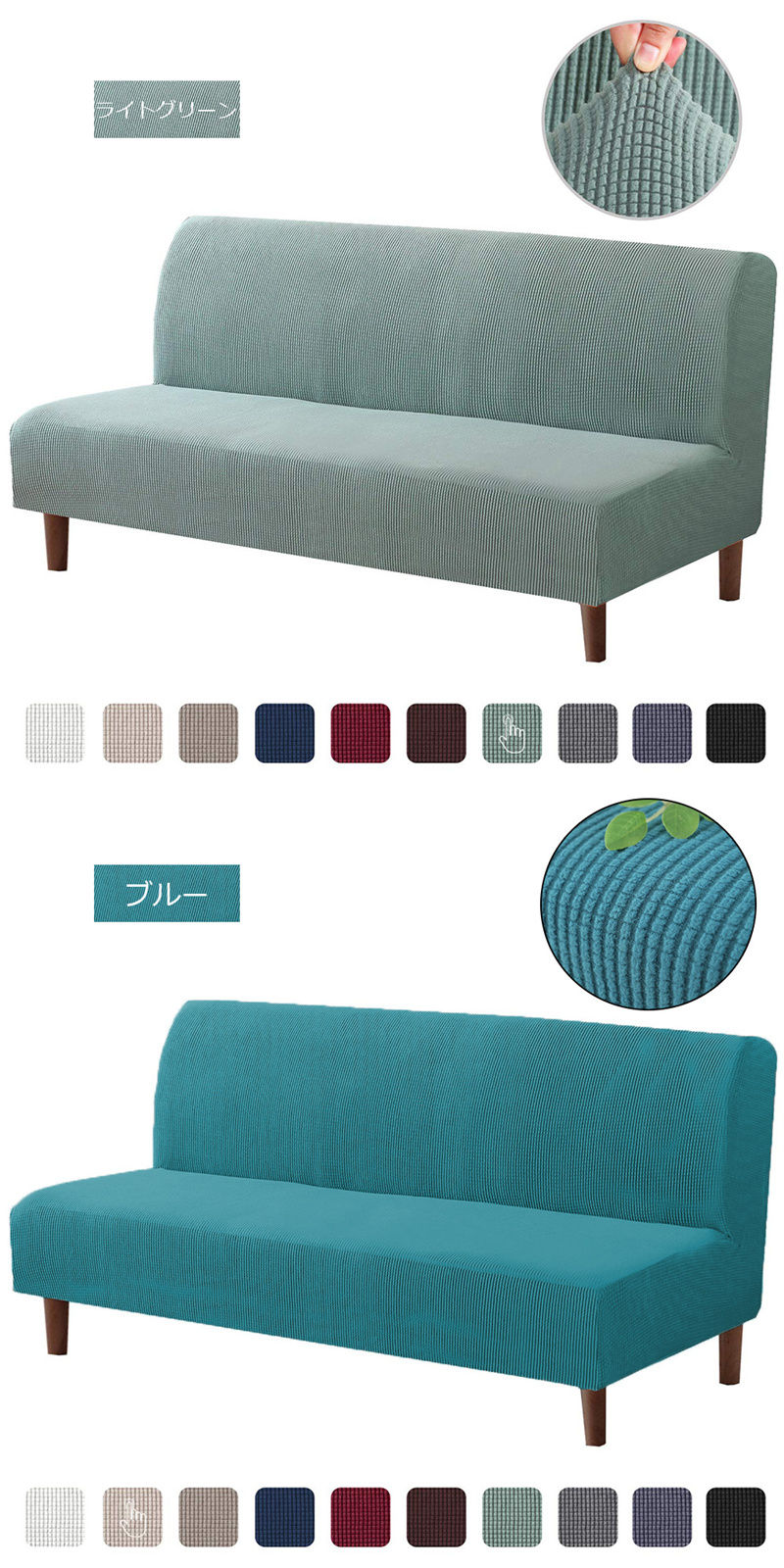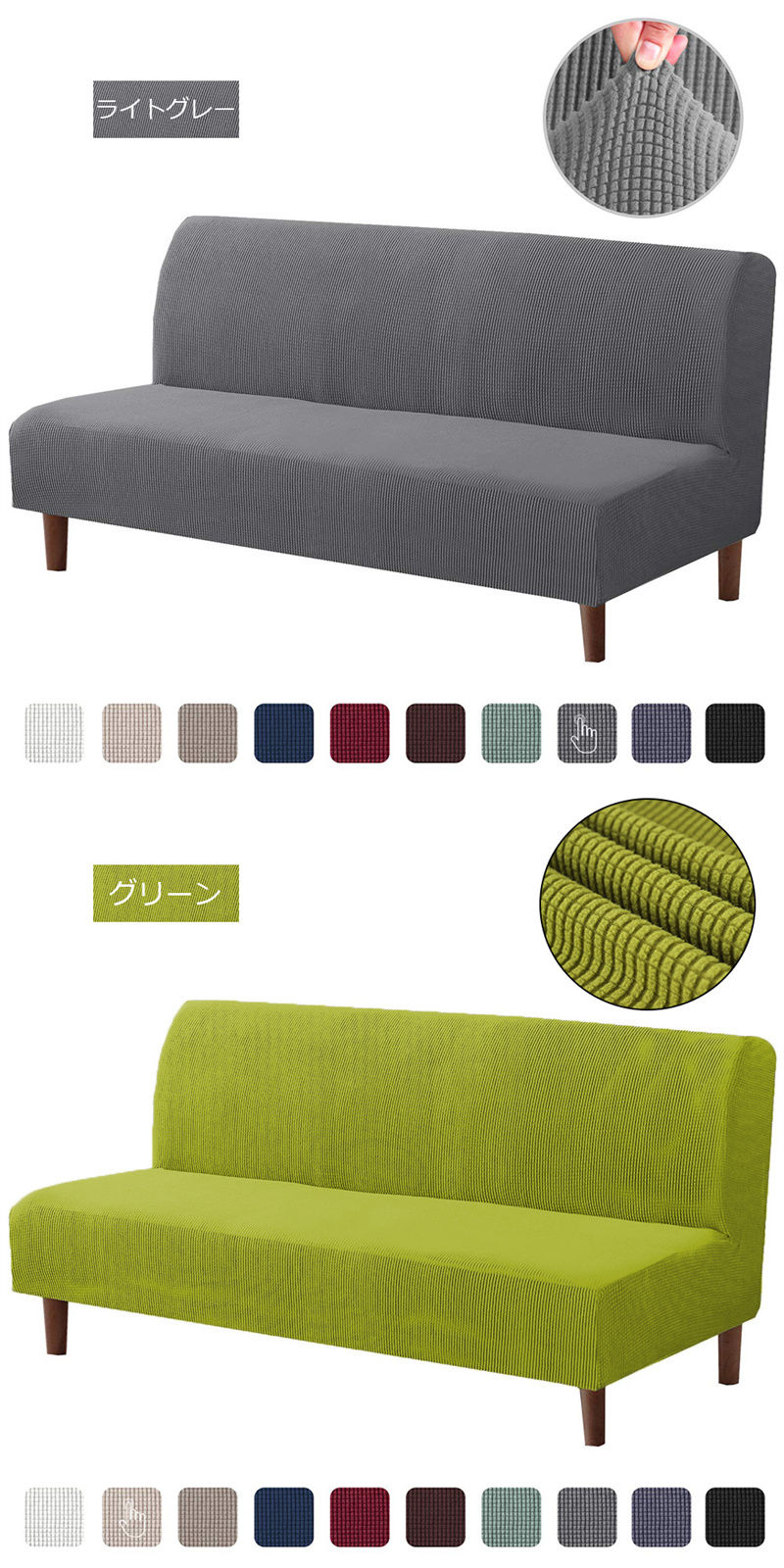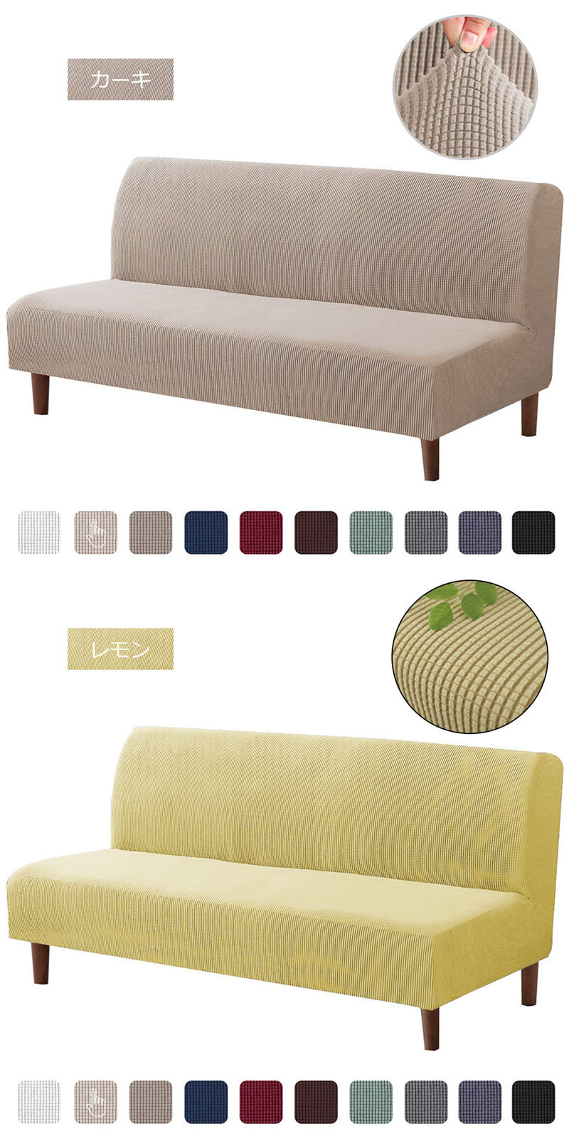 肘掛けなしソファカバー マルチカバー サイズS 値段:4,180円 サイズM 値段:4,580円 サイズL 値段:4,880円 ネイビー コーヒー ブラウン グレー ライトグレー グリーン ライトグリーン ブルー カーキ レモン ワイン オレンジ ブラック ホワイト