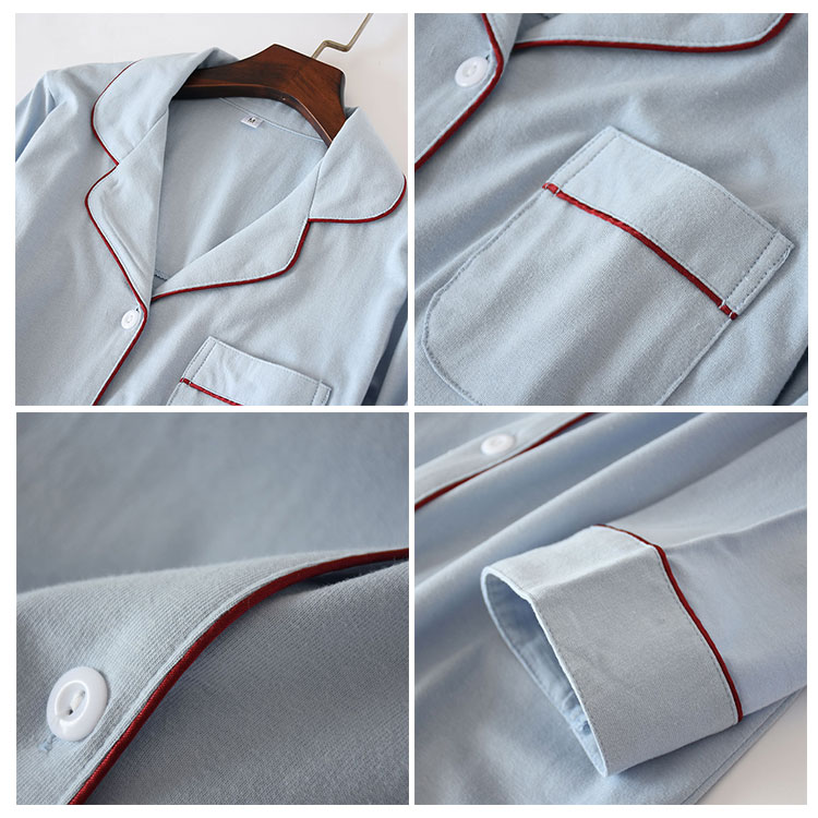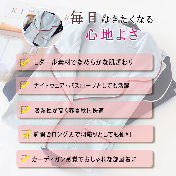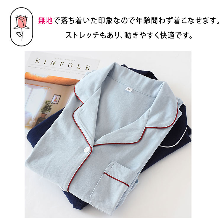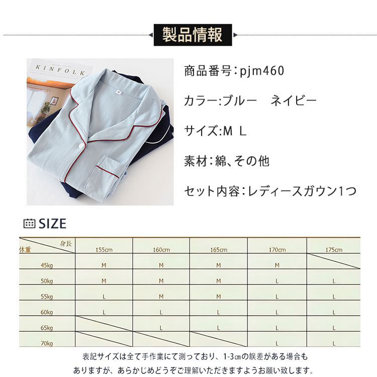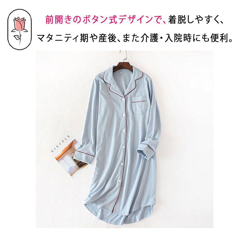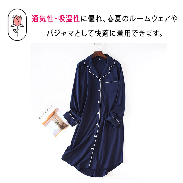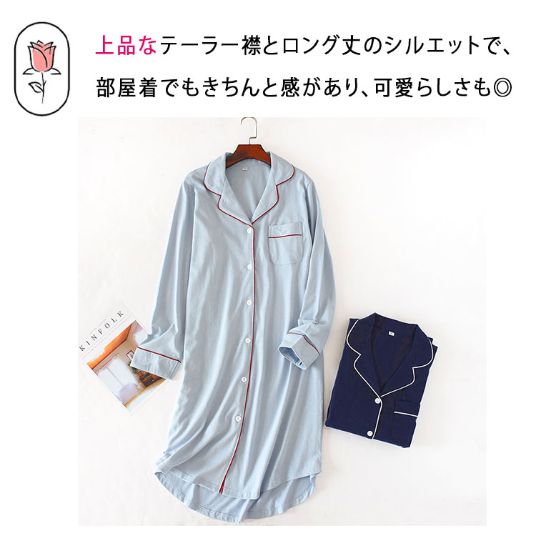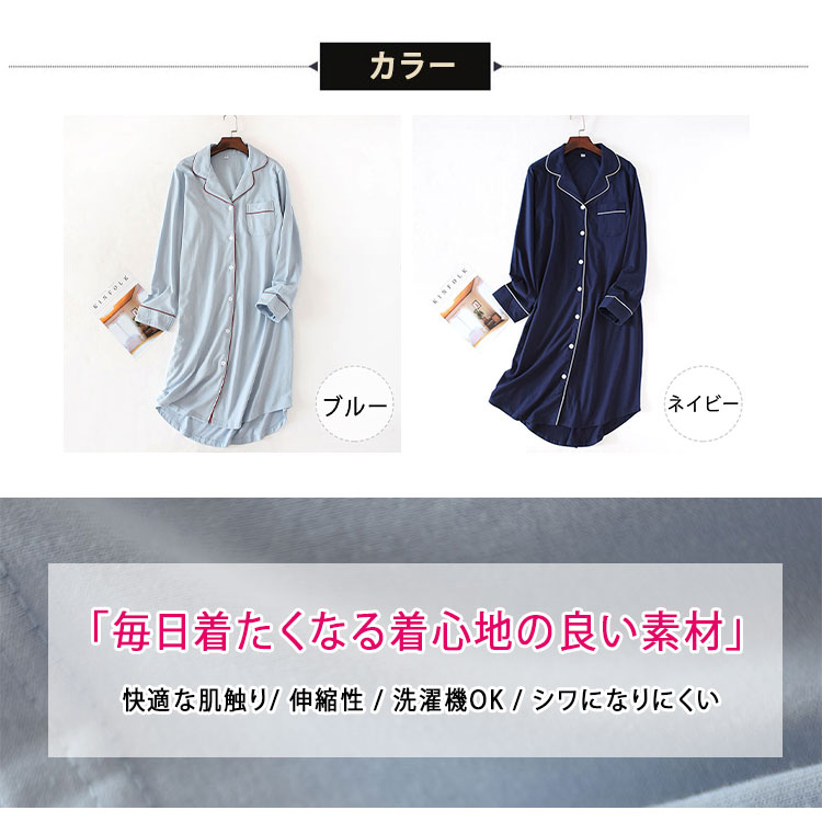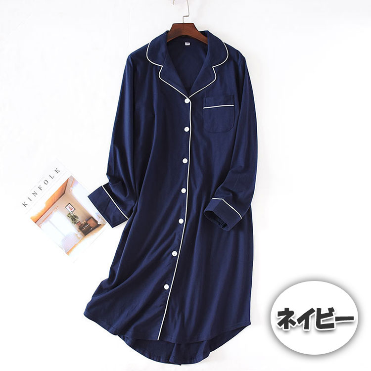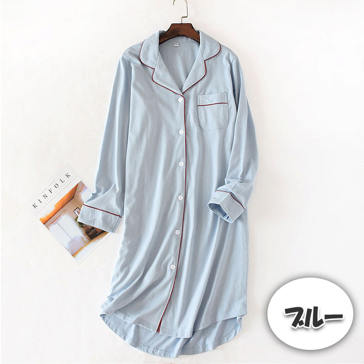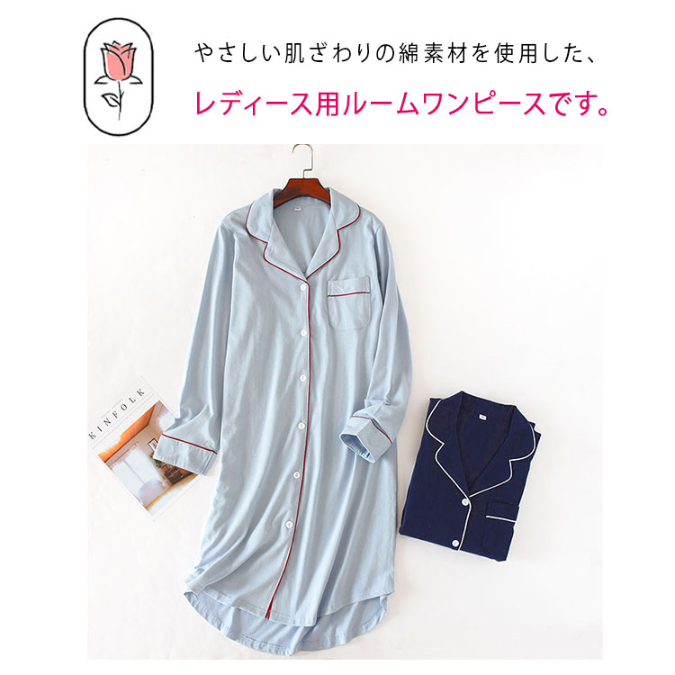ルームワンピース 前開き 長袖 レディ ブルー ネイビー M L