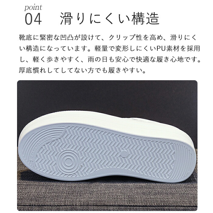 靴底に緊密な凹凸が設けて、クリップ性を高め、滑りにくい構造になっています。軽量で変形しにくいPU素材を採用し、軽く歩きやすく、雨の日も安心で快適な履き心地です。厚底慣れしてしてない方でも履きやすい。
