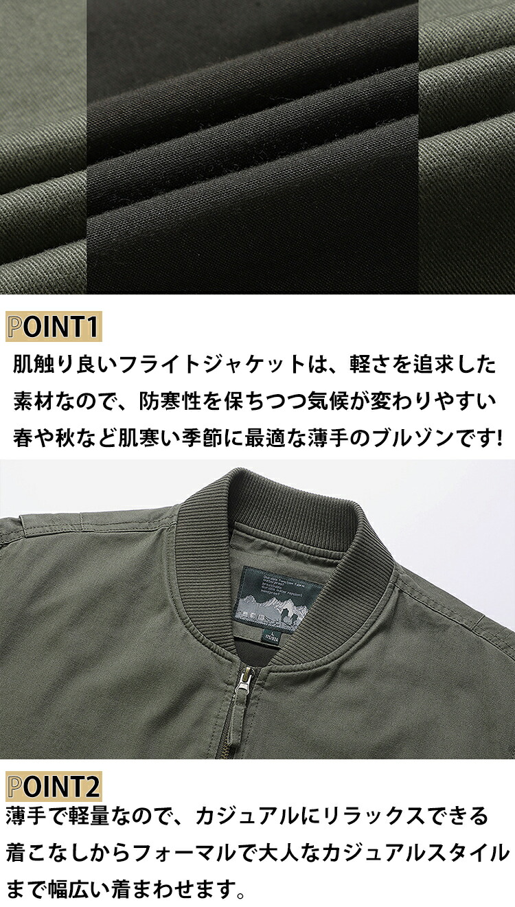 ※肌触り良いフライトジャケットは、軽さを追求した素材なので、防寒性を保ちつつ気候が変わりやすい春や秋など肌寒い季節に最適な薄手のブルゾンです!