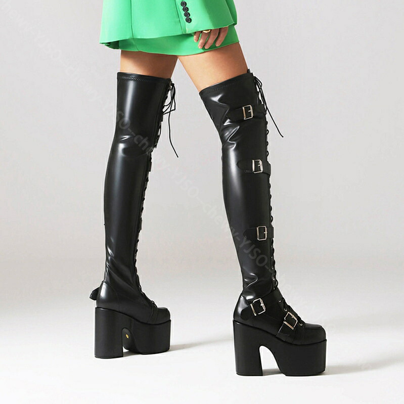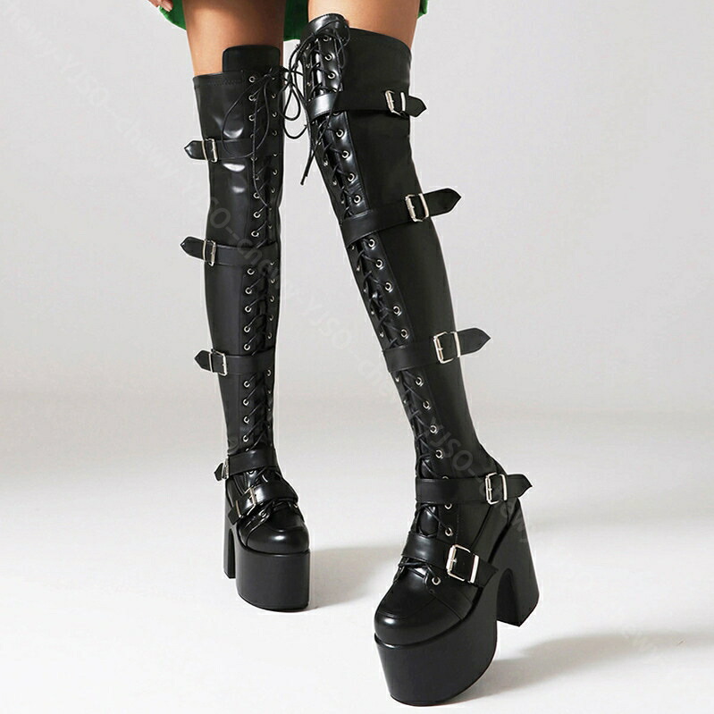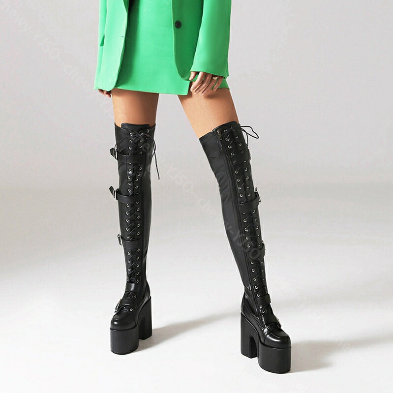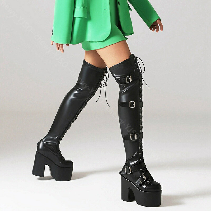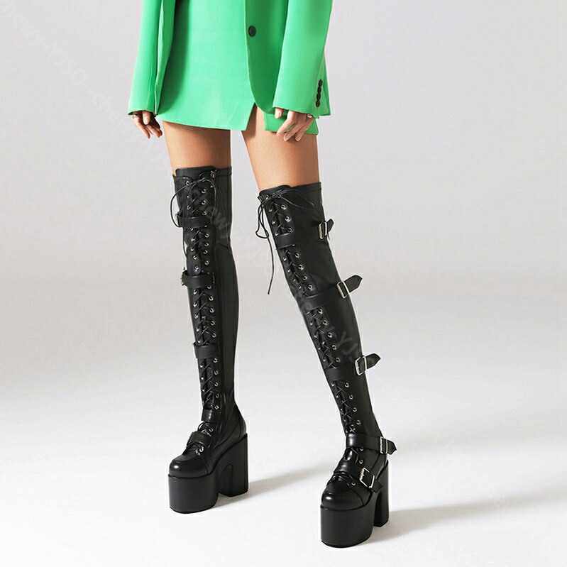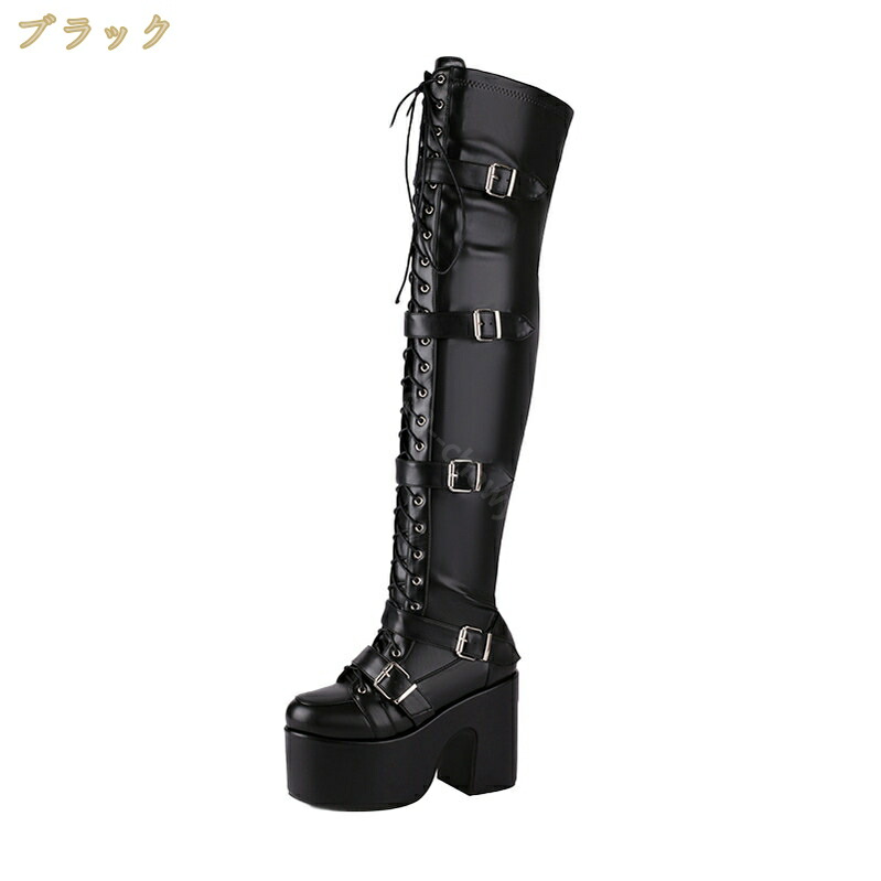 ゴスロリ 風 編み上げ 厚底 ニーハイ ロング ブーツ レースアップ ゴシック ロリータ レディース ガールズ ハイヒール 美脚 11.5センチ レースアップブーツ サイハイブーツ 編み上げブ ヒール