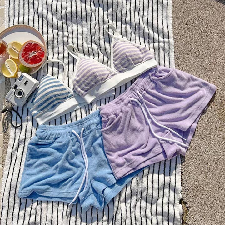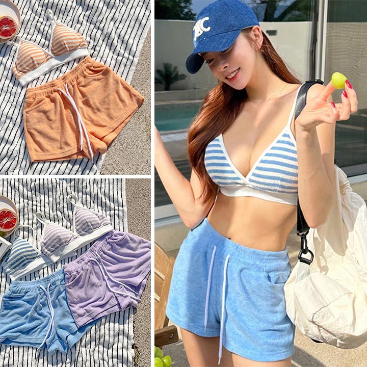 パイル生地 スイムウェア ビーチウェア 水着 ビキニ 三角ビキニ 部屋着 ボーダー ショートパンツ 体型カバーママ水着 プール フェス セット水着 カジュアル 海