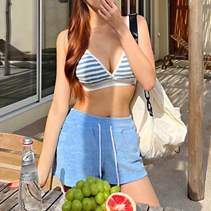 パイル生地でカジュアルな印象の三角ビキニ水着です。ボトムスはショートパンツなので、ぽっこりお腹が気になる方にもおススメです。