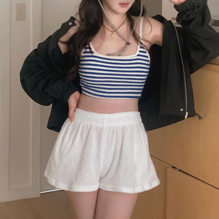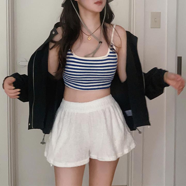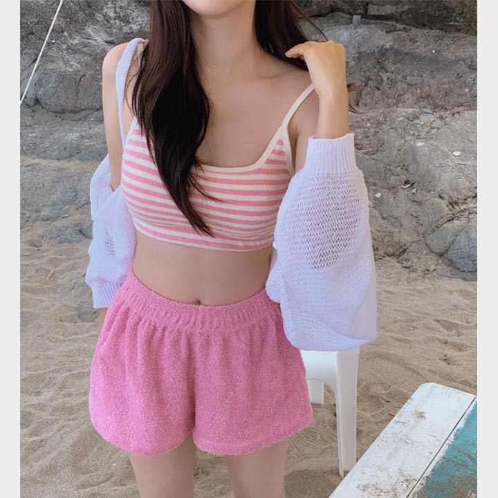 キャミソールタイプのカジュアル水着。トップスは可愛いボーダー柄です!上下ともにパイル生地なので部屋着にしても◎