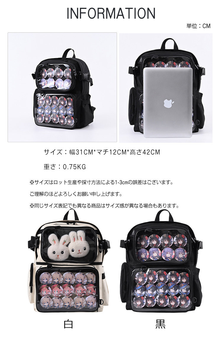 痛バッグ A4 痛バ リュック ボディ バッグ 男女兼用バッグ バックパック リュック 豊富 黒 白