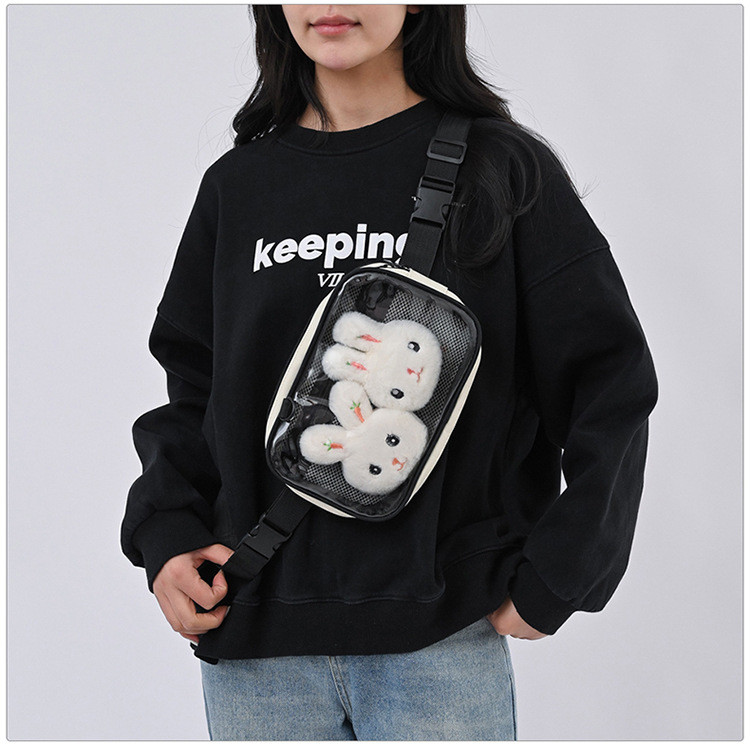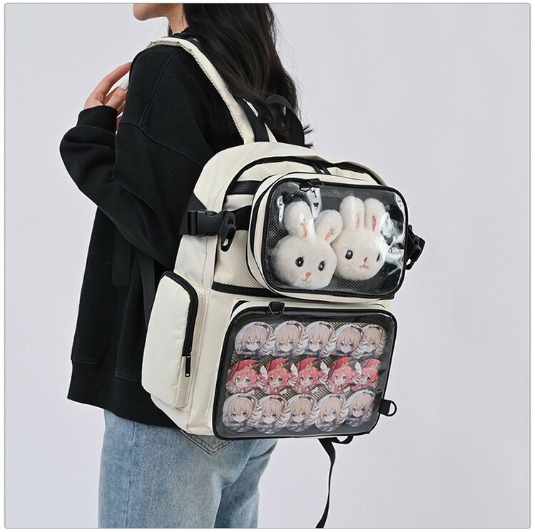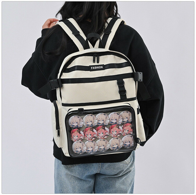 バッグの正面には透明な部分があり、そこにはお気に入りのキャラクターグッズや装飾品を自由に挿入することができます。この機能は、バッグを自分だけのオリジナルなアイテムにカスタマイズすることができ、個性を表現するのに最適です。