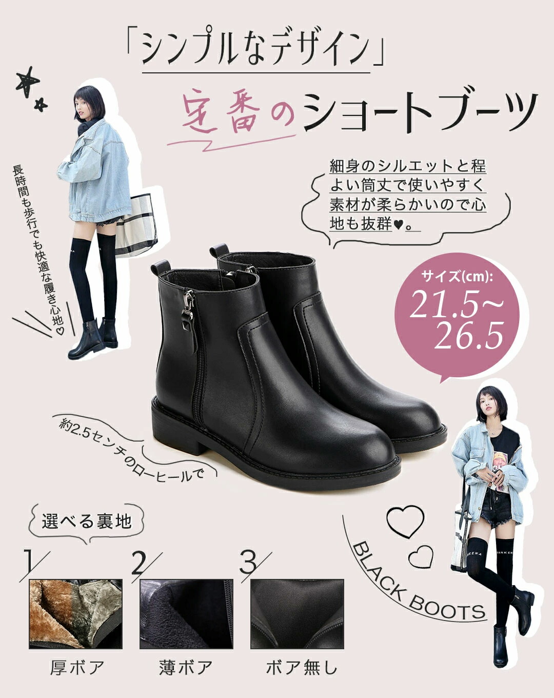 ローヒール ショートブーツ レディース 靴 新登場! 21.5 22.0 22.5 23.0 23.5 24.0 24.5 25.0 25.5 26.0 26.5 ブラック/ボア無し ブラック/薄ボア ブラック/厚ボア