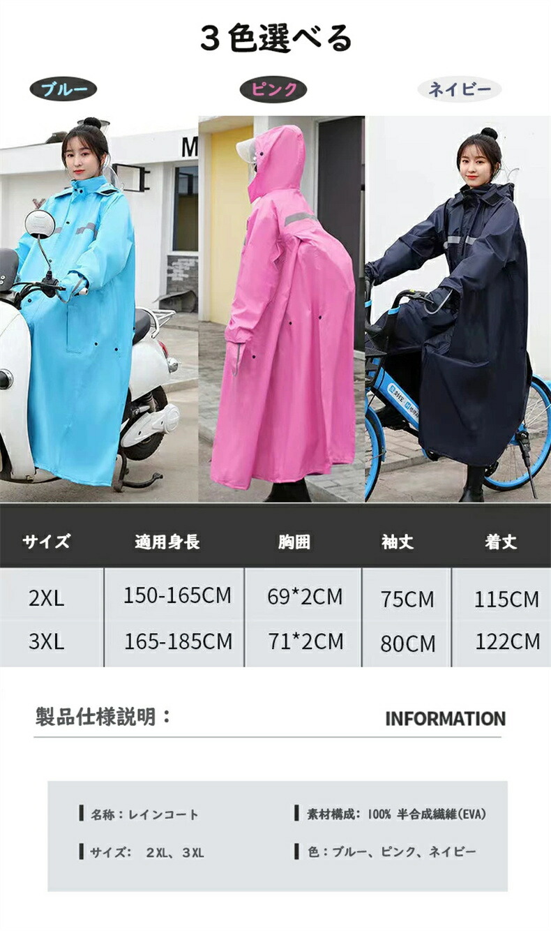 レインコート レディース 自転車 バイ レインウエア レインコート 続々入荷中 2XL(適合身長:150-165cm) 3XL(適合身長:165-185cm)