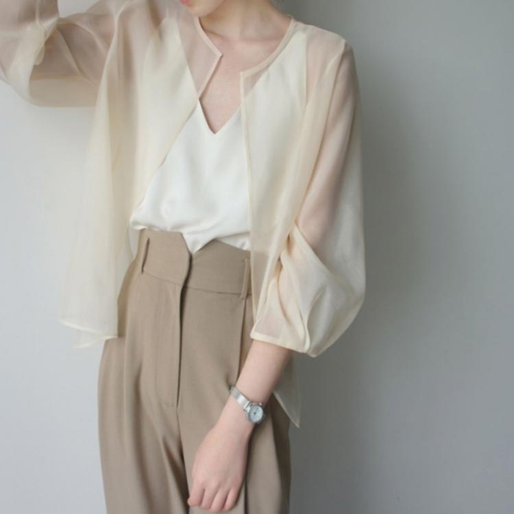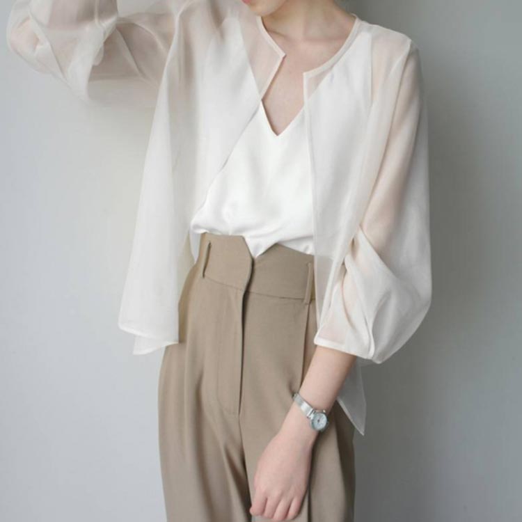 シアートップス ノーカラー レディース トップス シャツ ブラウス 超目玉商品 オフホワイト ホワイト S M L XL 2XL