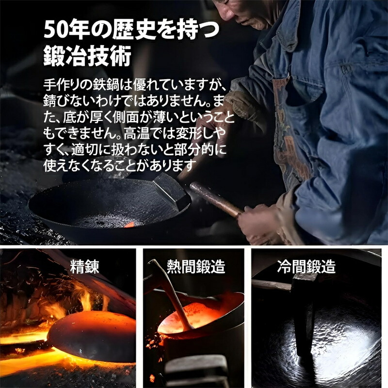 特殊な精製工程とハンマー加工により、鍋表面に自然なノンスティック層を形成。食材の付着を防ぐことで調理後の洗浄が簡単になり、調理効率が向上します。