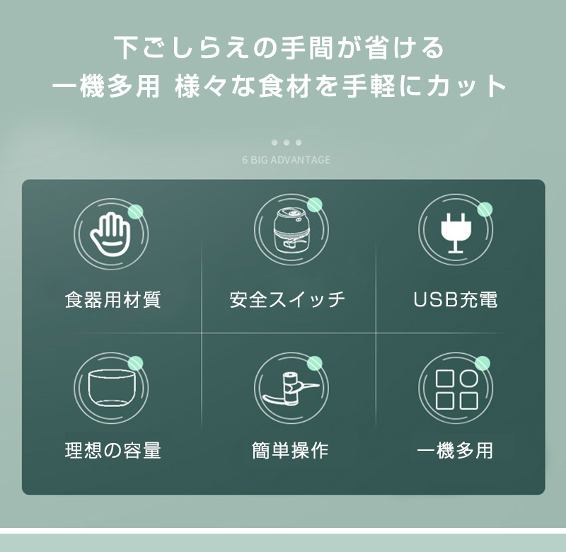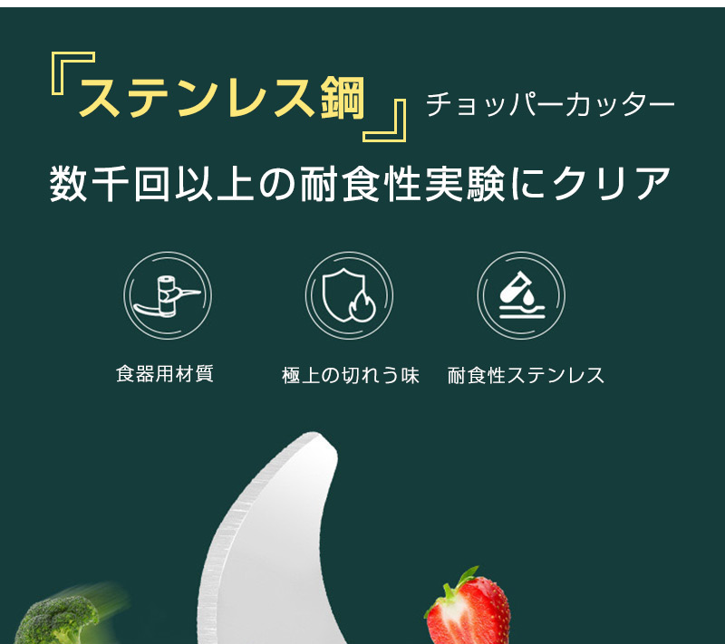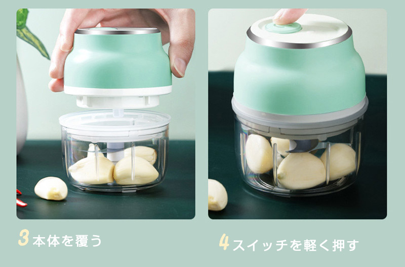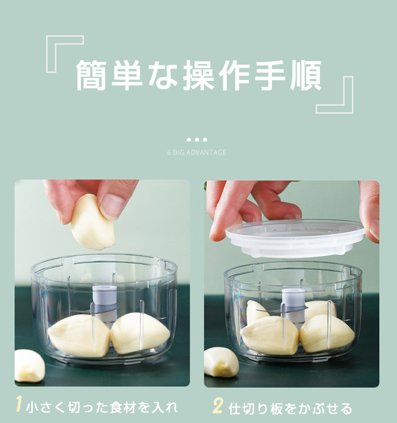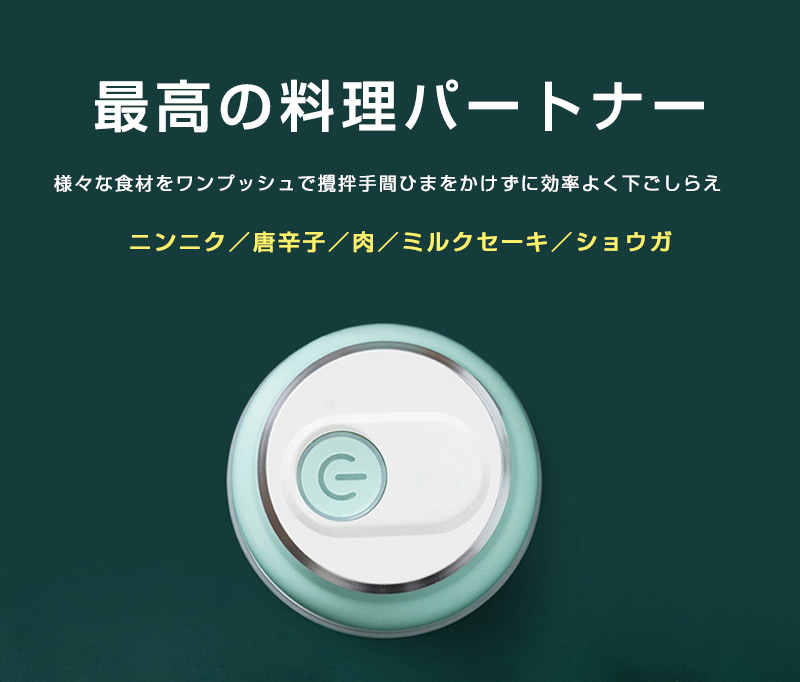 離乳食、ニンニク、玉ねぎ、ショウガ、唐辛子、肉、ピーナッツなど様々な食材を素早くカットできます。下ごしらえの手間を省け、刺激臭のある食材から解放され、料理をより楽しくできます。